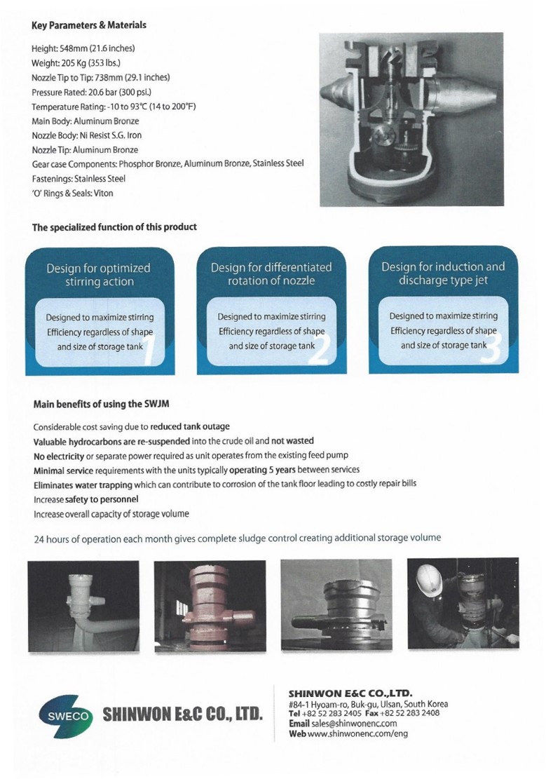 SHINWON E&C Jet Mixer, SWJM, is a device for directing a submerged jet of crude oil across a pre-selected area of the bottom of a crude oil storage tank. This jet of crude oil dissolves and re-suspends the accumulated sludge throughout the overhead oil.