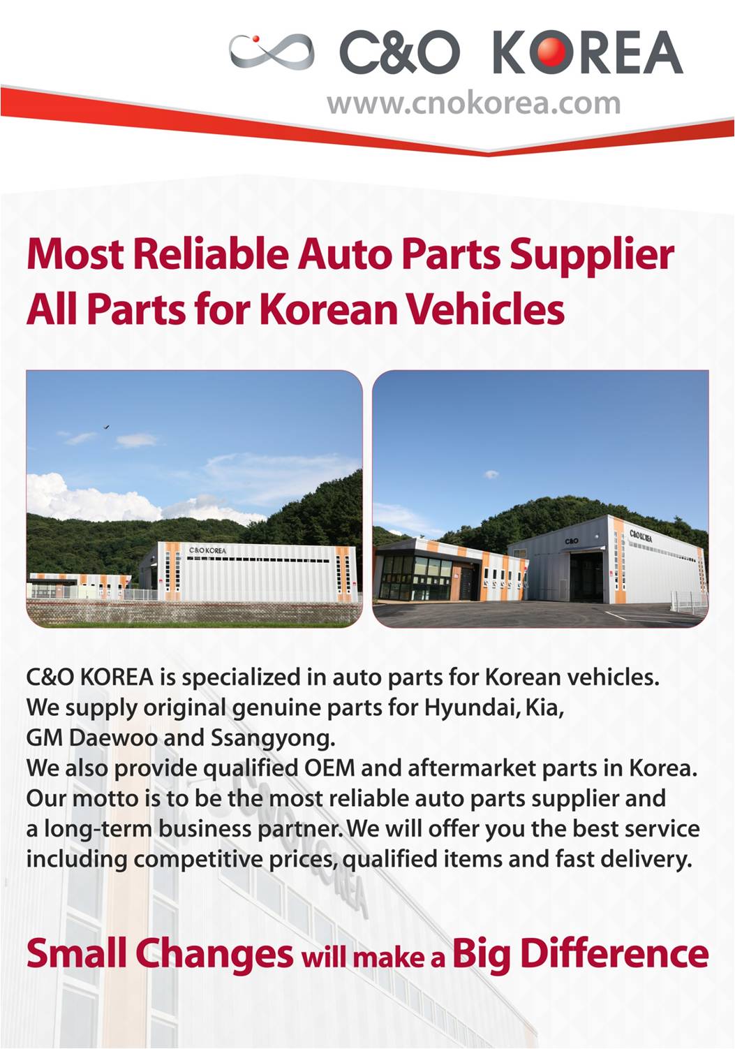C&O KOREA is specialized in auto parts for Korean vehicles. We supply original genuine parts for Hyundai, Kia, GM Daewoo and Ssangyong. We also provide qualified OEM and aftermarket parts in Korea.