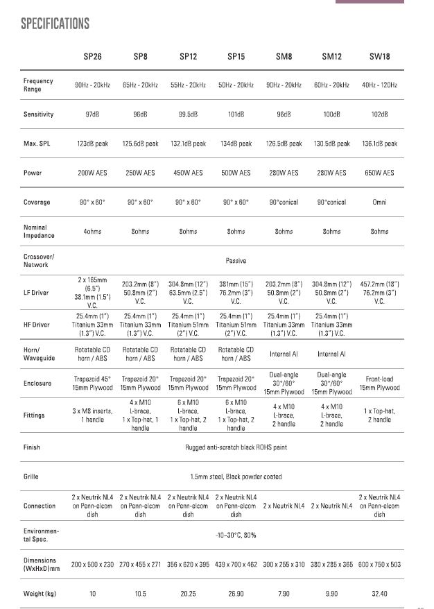 SP series is standard point source. SP series is a system that maintains the tone balance even at the maximum output. SP series adpots high-end drivers that are manufactured in the U.S.A. The materials of network are from Korea and the connector or other materials are supplied from professional sepaker material companies, internationally proven for technology. SP series speaker is finished RoHS compliance paint.