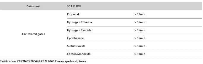 · SCA119FN provides shot-term protection against eye irritation and breathing hazardous fumes released from burning plastic materials during evacuation.