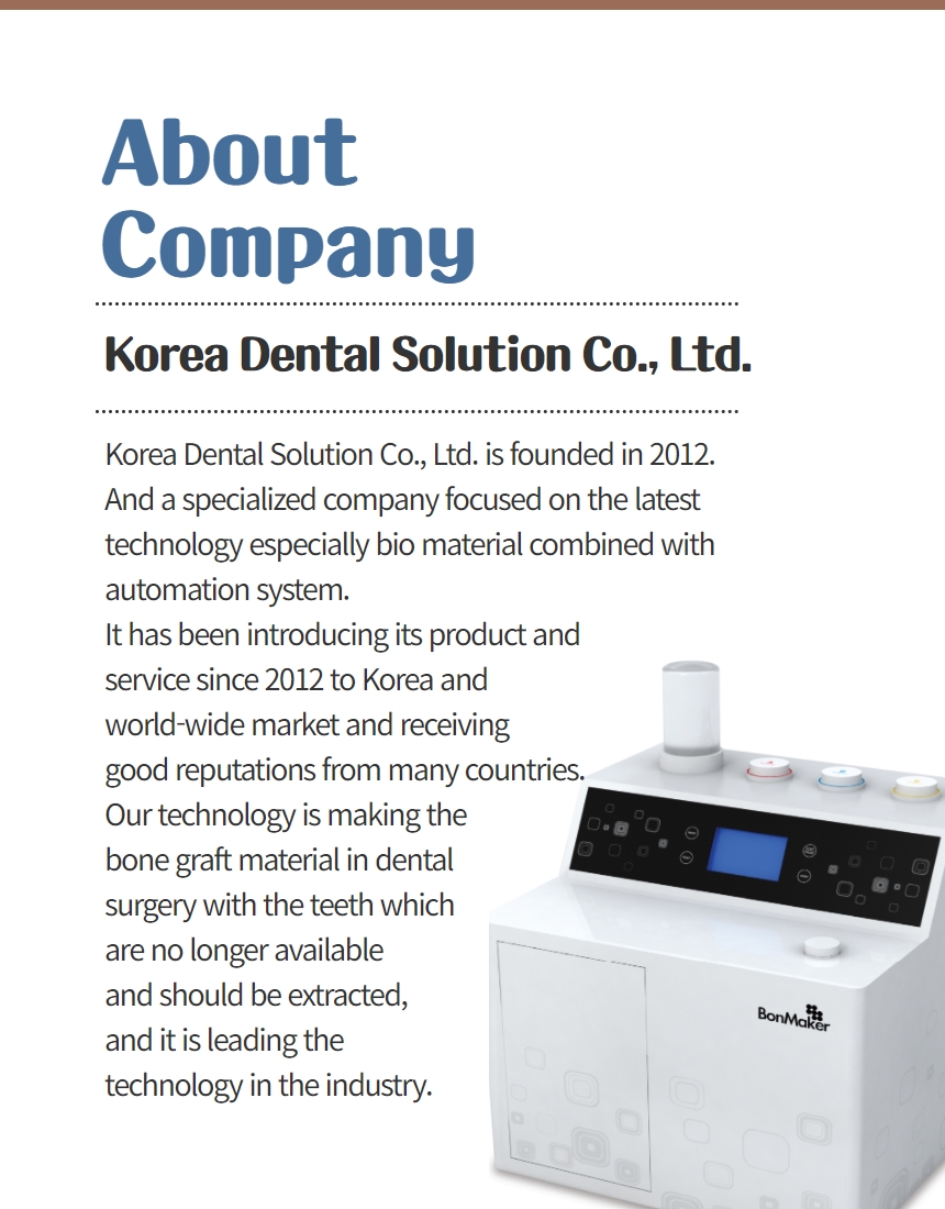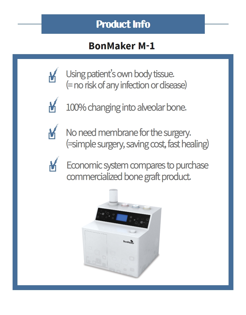 "BonMaker" is the world's first fully automated machine and the first device that has acquired a medical CE certificate in the market. “BonMaker” is used to extract a patient's useless extracted tooth to make customized bone graft material for implant surgery or relevant dental treatment within a short time. The object material from BonMaker called "ATB(Auto-Tooth Bone)" graft material overcomes every limitation of using current commercialized bone graft material in the market. We have several intellectual property rights in Korea, USA, Europe, China and Brazil as a leading company in the relevant field of the worldwide market.