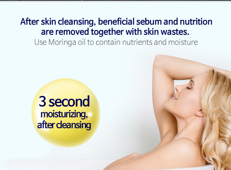Vegetable essential oils containing 99.5% moringa extract. Within 3 seconds after cleansing, moisture and nutrients are released on the skin.