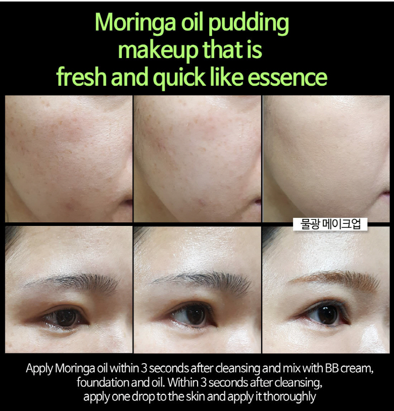 Apply Moringa oil within 3 seconds after cleansing and mix with BB cream, foundation and oil. Within 3 seconds after cleansing, apply one drop to the skin and apply it thoroughly.