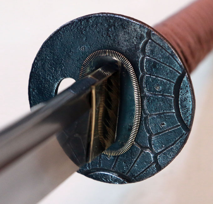 " 菊きくの花 chrysanthemum" " blade was folded 10 times creating 1024 layers. Straw and coal was used to control the carbon content of the steel. Once impurities within the steel are expelled, the steel becomes carbon steel (高炭素鋼]). This outer skin(kawagane) is wrapped around a softer iron core(shingane). Then俊基(Jun Gi), apprentice of famed swordsmith國正(Kunimasa Matsuba) of Miyazaki prefecture, uses a traditional Japanese hearth and follows a strict guideline of his sensei to forge the blade (kitae).