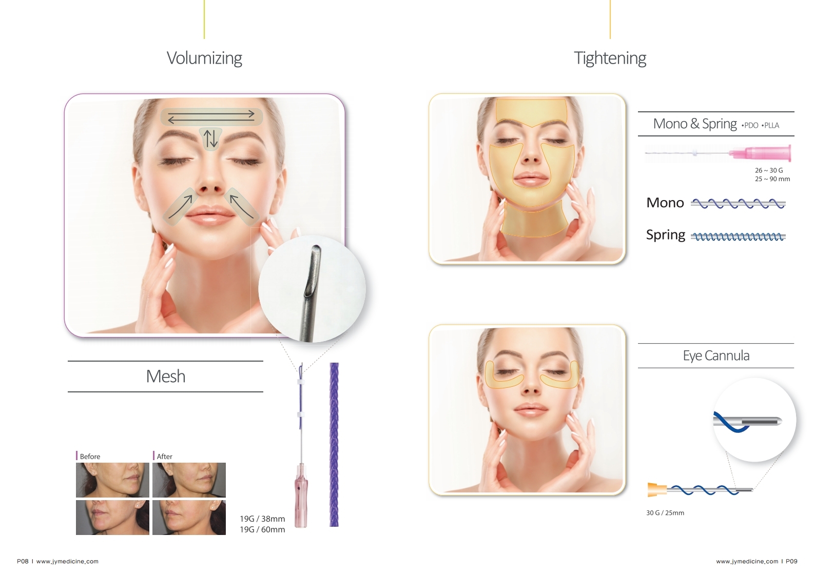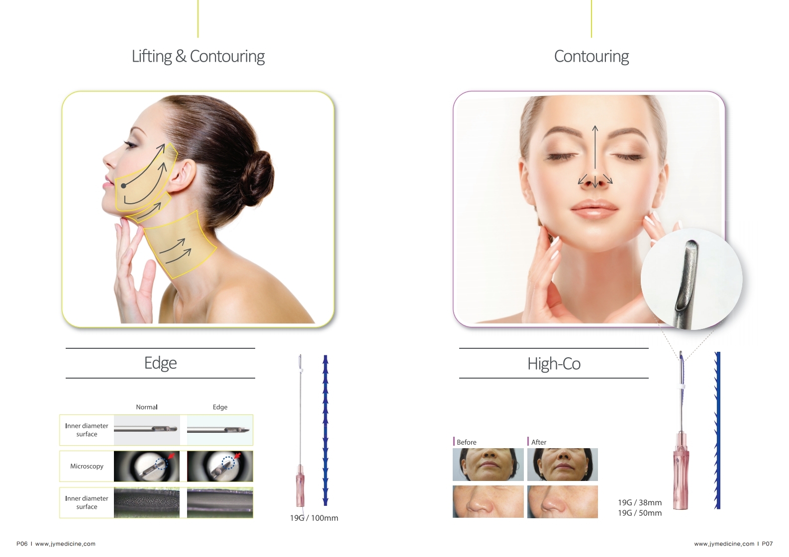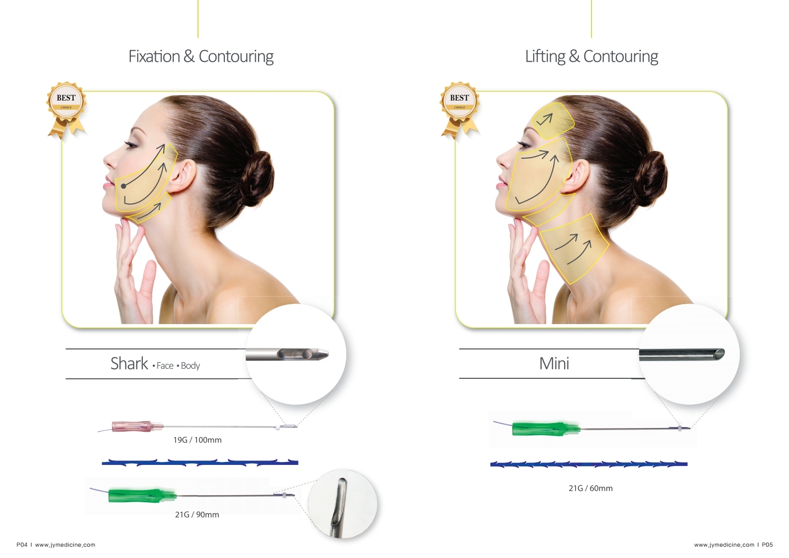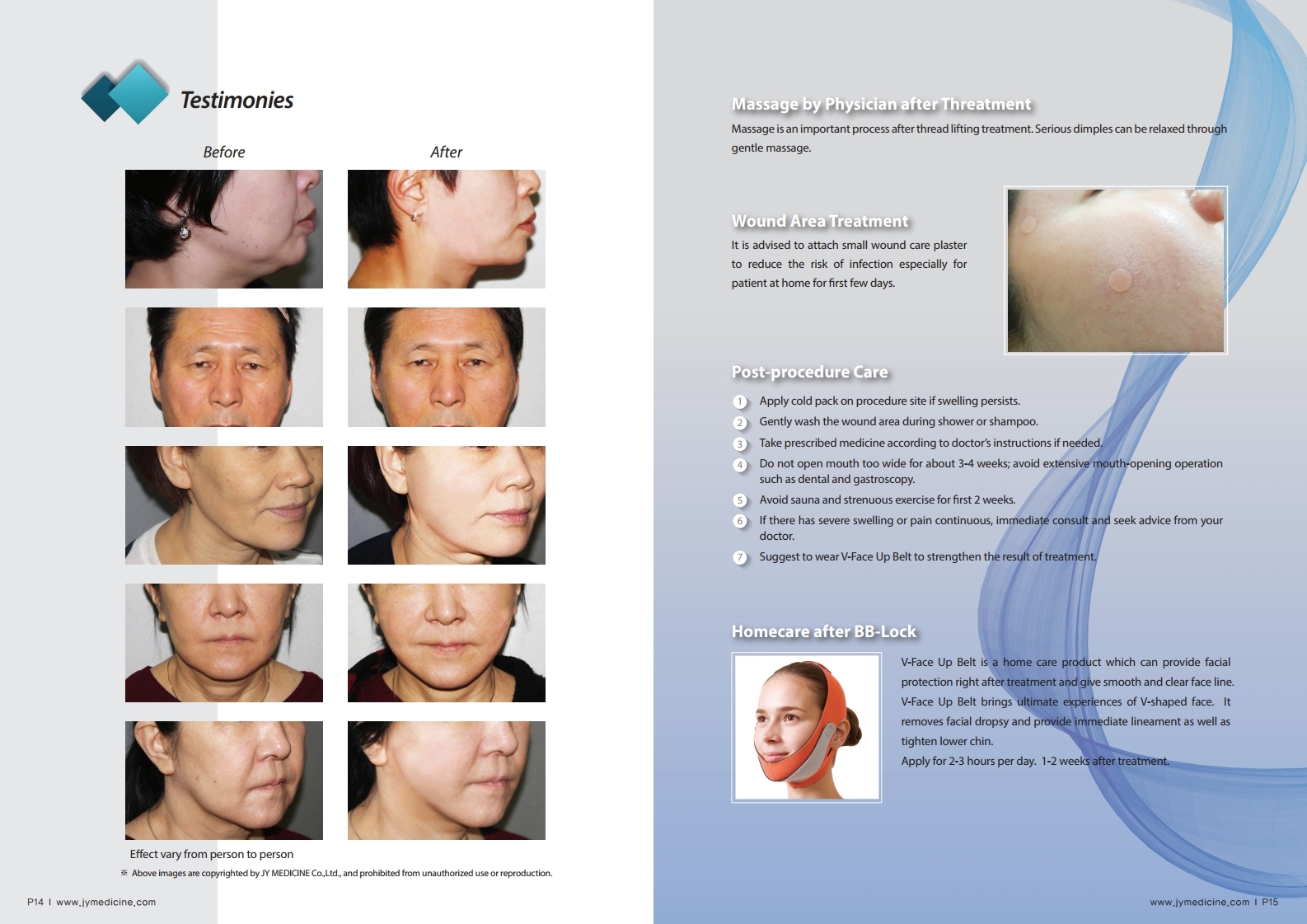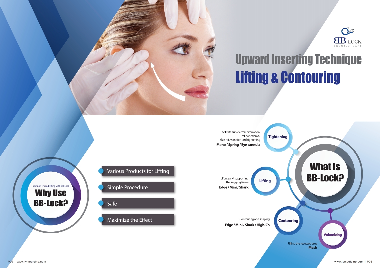 To overcome limitation of general thread lifting methods, “BB-Lock” is directly inserted into the sagging part to upward to create a lifting effect through the transfer of volume. As a result, the lifting force is applied to a wider area as compared to regular thread lifting, bringing about excellent fixation and tightening effects.