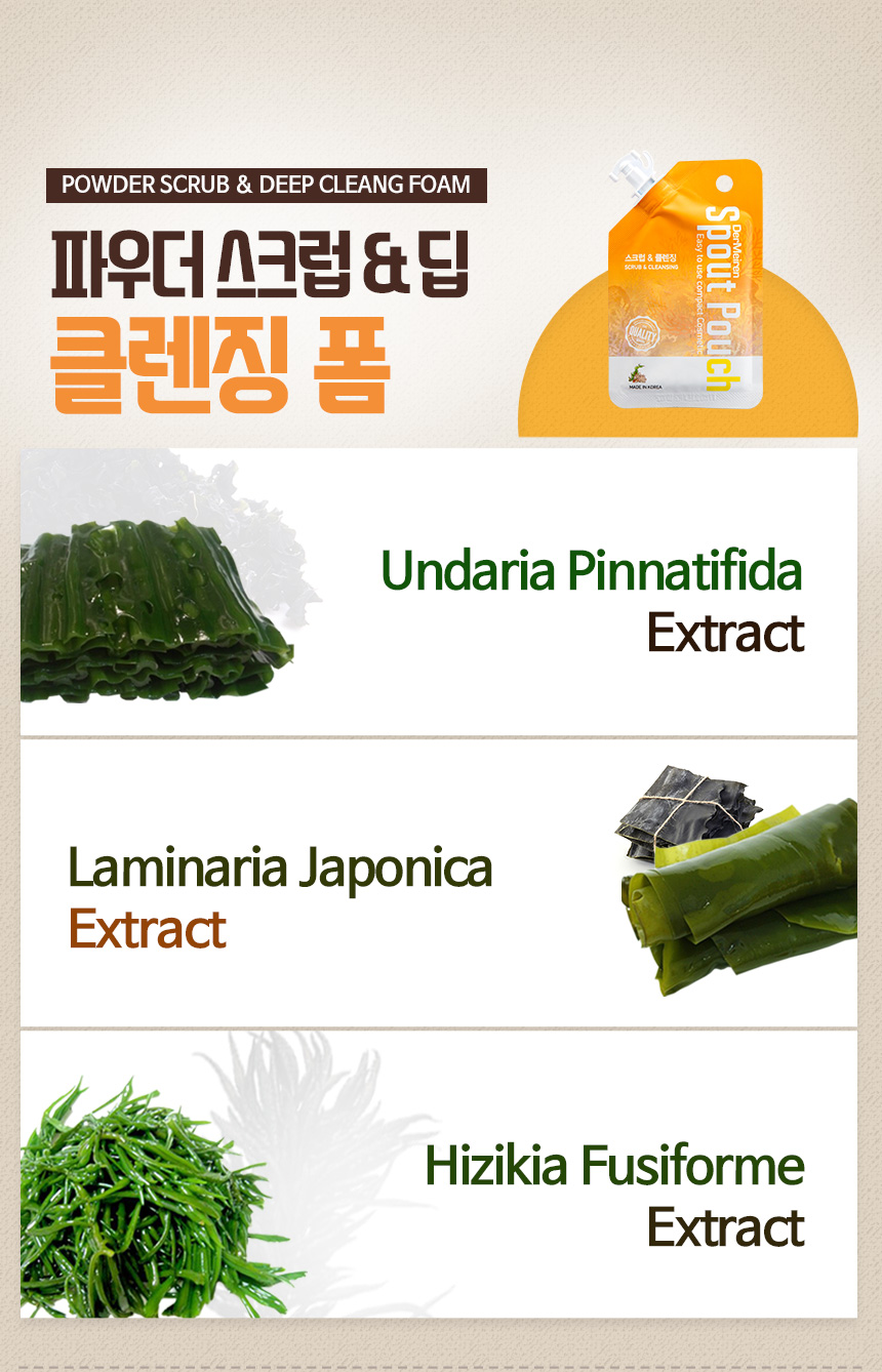 Powder scrub effectively removes skin waste and old keratin. Seaweed extract with rich foam moisturizes and softens the skin during cleansing, and enhances the refreshment.