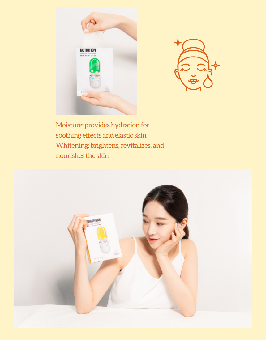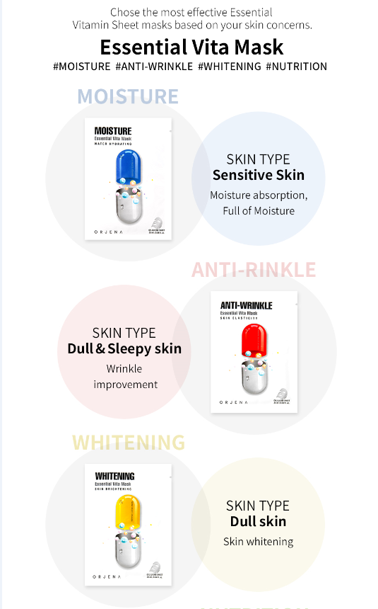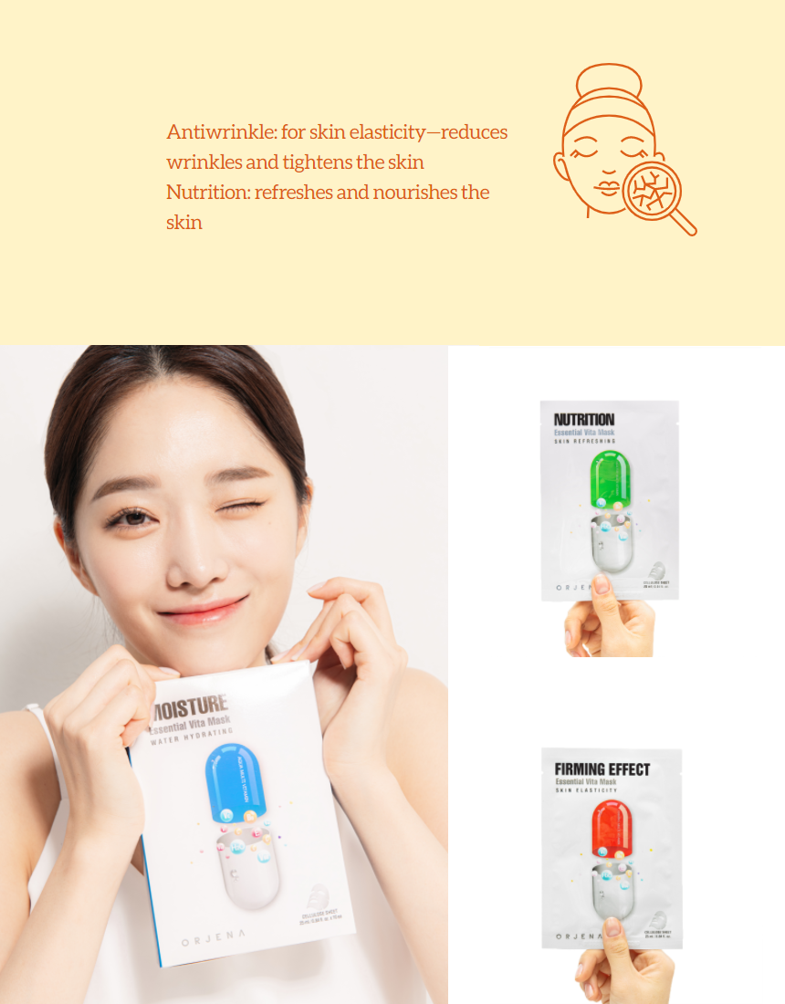 If you're searching for the easiest way to get a quick hydration boost, nourishment, anti-wrinkle effects in a short amount of time, ORJENA ESSENTIAL VITAMIN MASK SHEETS can be one of the best options to chose! It contains ALL NATURAL ingredients that come straight from Mother Nature and a high concentration of components such as;