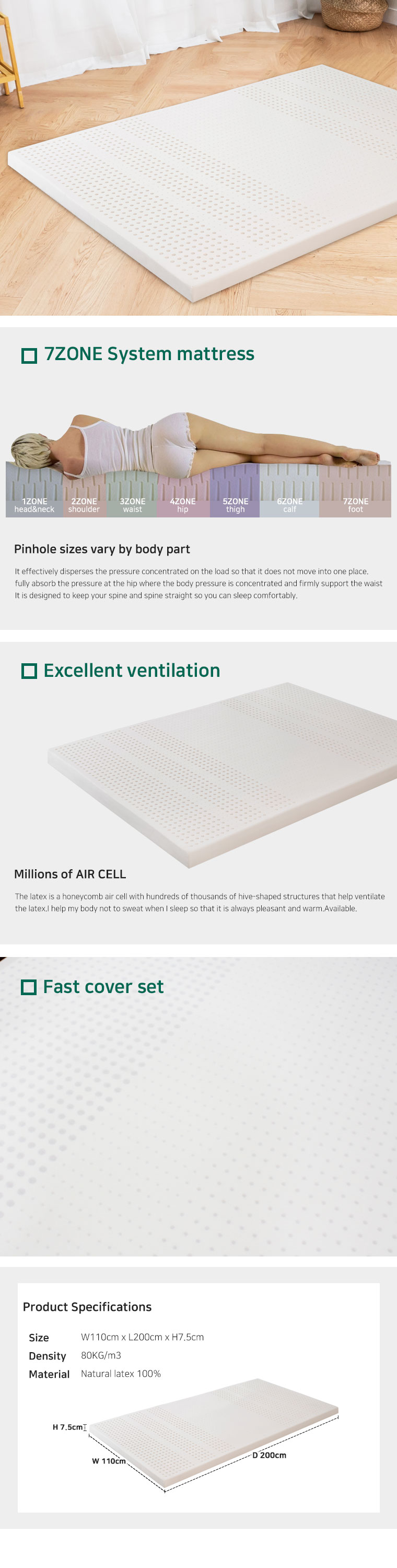 The latex features hundreds of thousands of honeycomb air cells, helping to ventilate and circulate the latex.