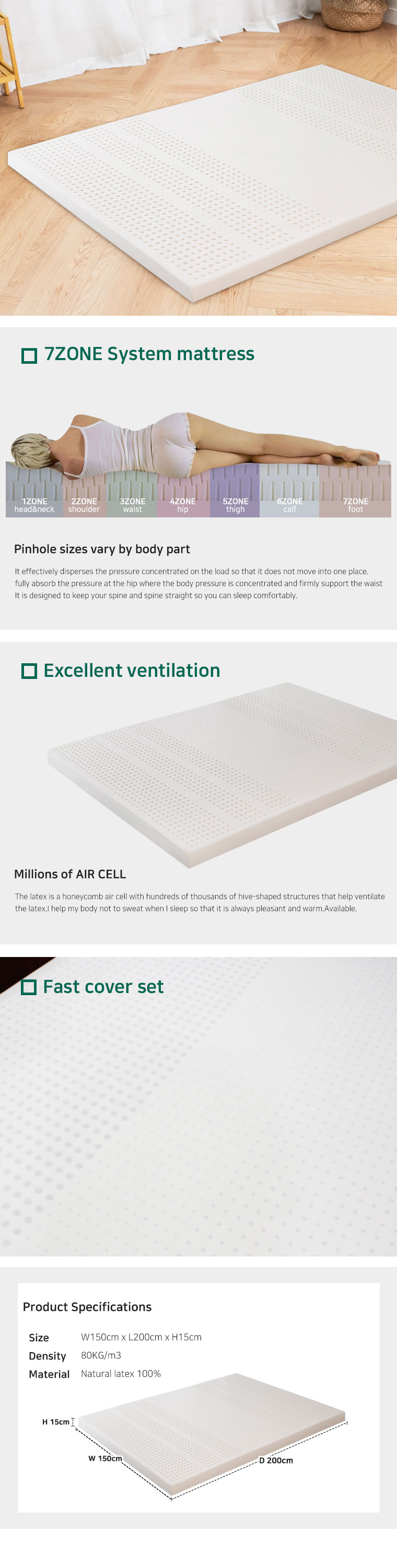 The latex features hundreds of thousands of honeycomb air cells, helping to ventilate and circulate the latex.