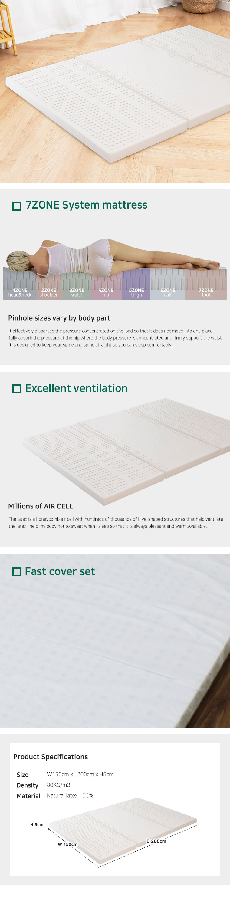 The latex features hundreds of thousands of honeycomb air cells, helping to ventilate and circulate the latex.