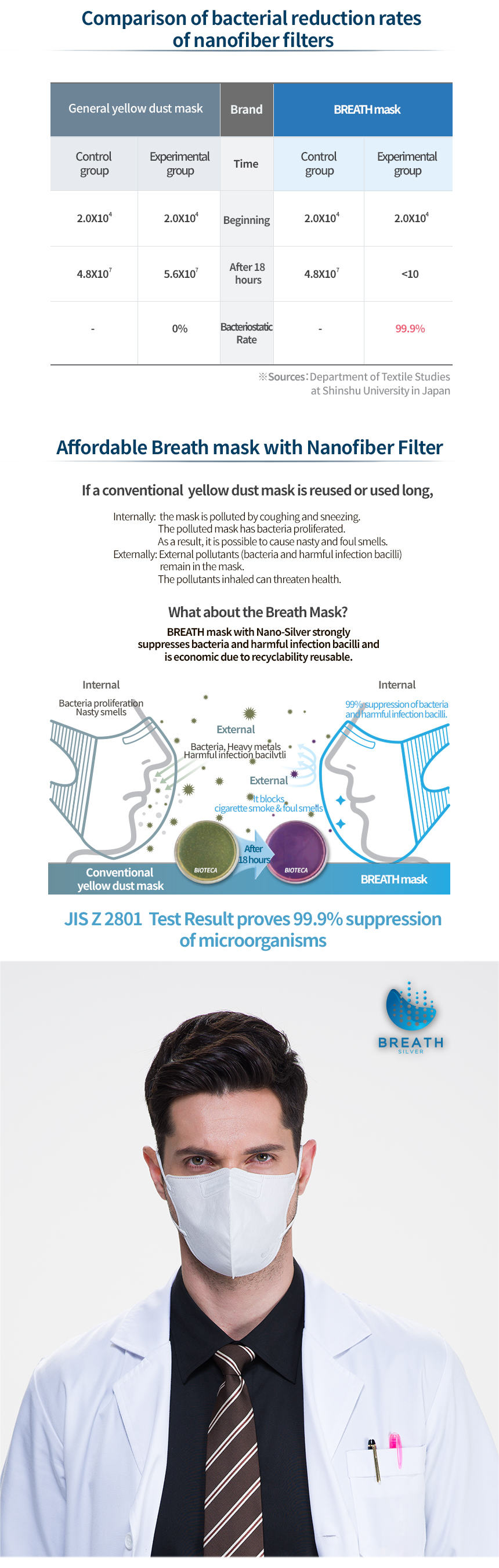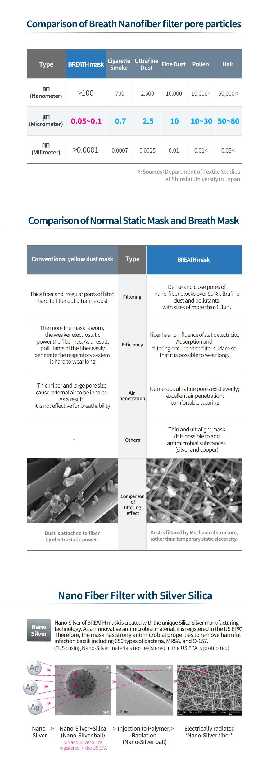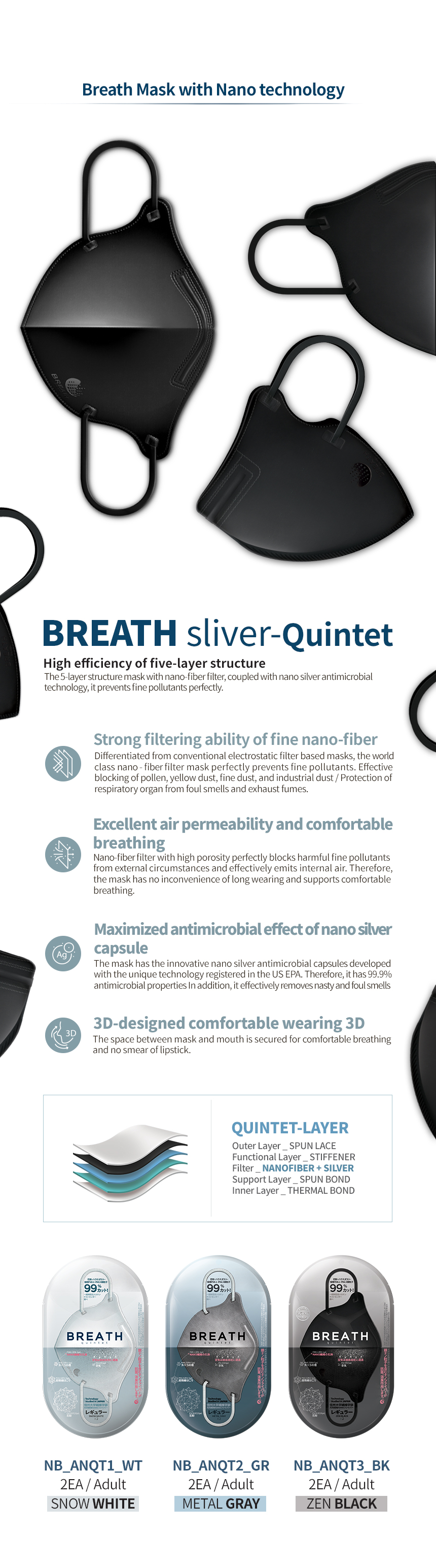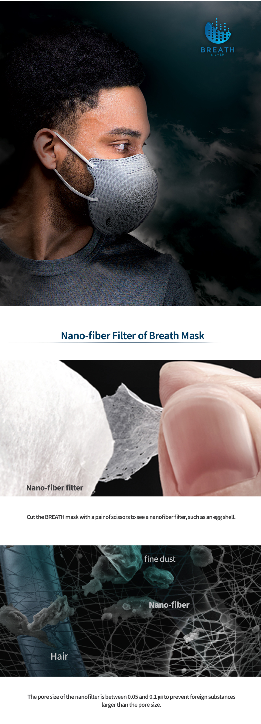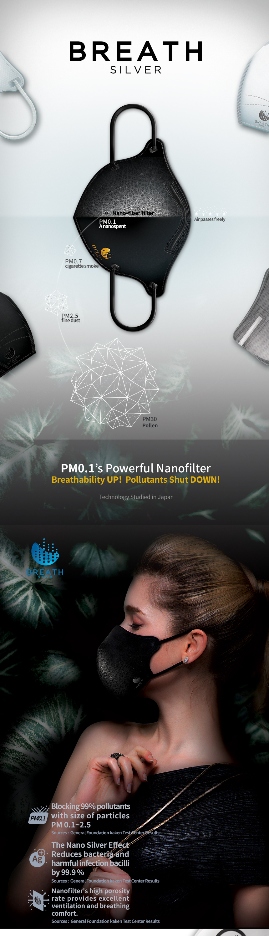 Prevents 99% of micro dust! Strong filtering ability, Breath silver Mask , Excellent breathability, 99.9% Maxmized antimicrobial effect,3D-designed comfortable wearing