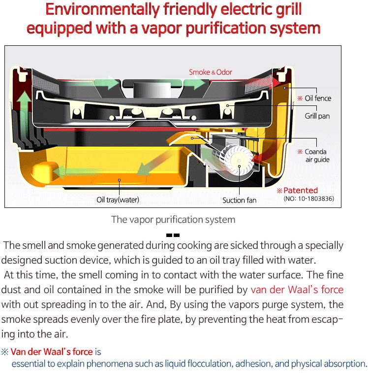 Environmentally-friendly electric grill equipped with a vapor purification system.