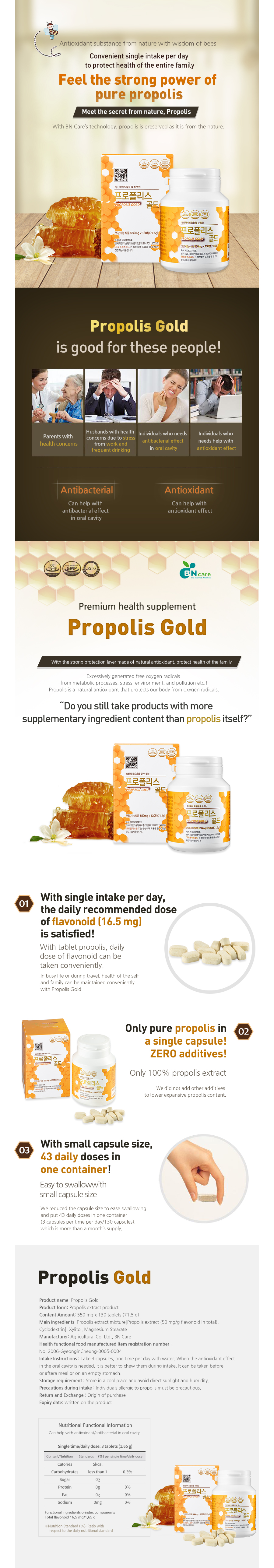 - When you're busy or traveling, you and your family's health can be maintained conveniently with Propolis Gold.