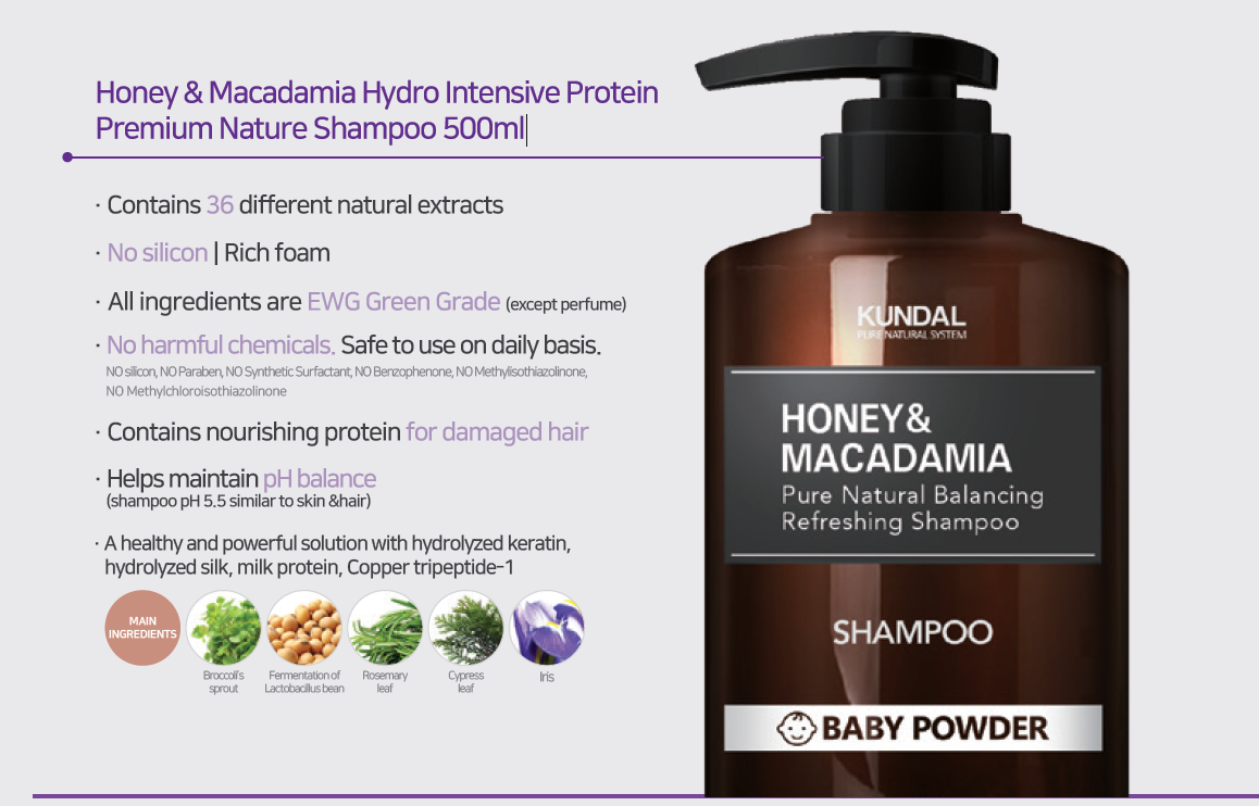 all-natural shampoo with honey and macadamia oil extracts-contains no harmful chemicals and leaves the hair soft and silky upon application`1 in Amazon of Korea