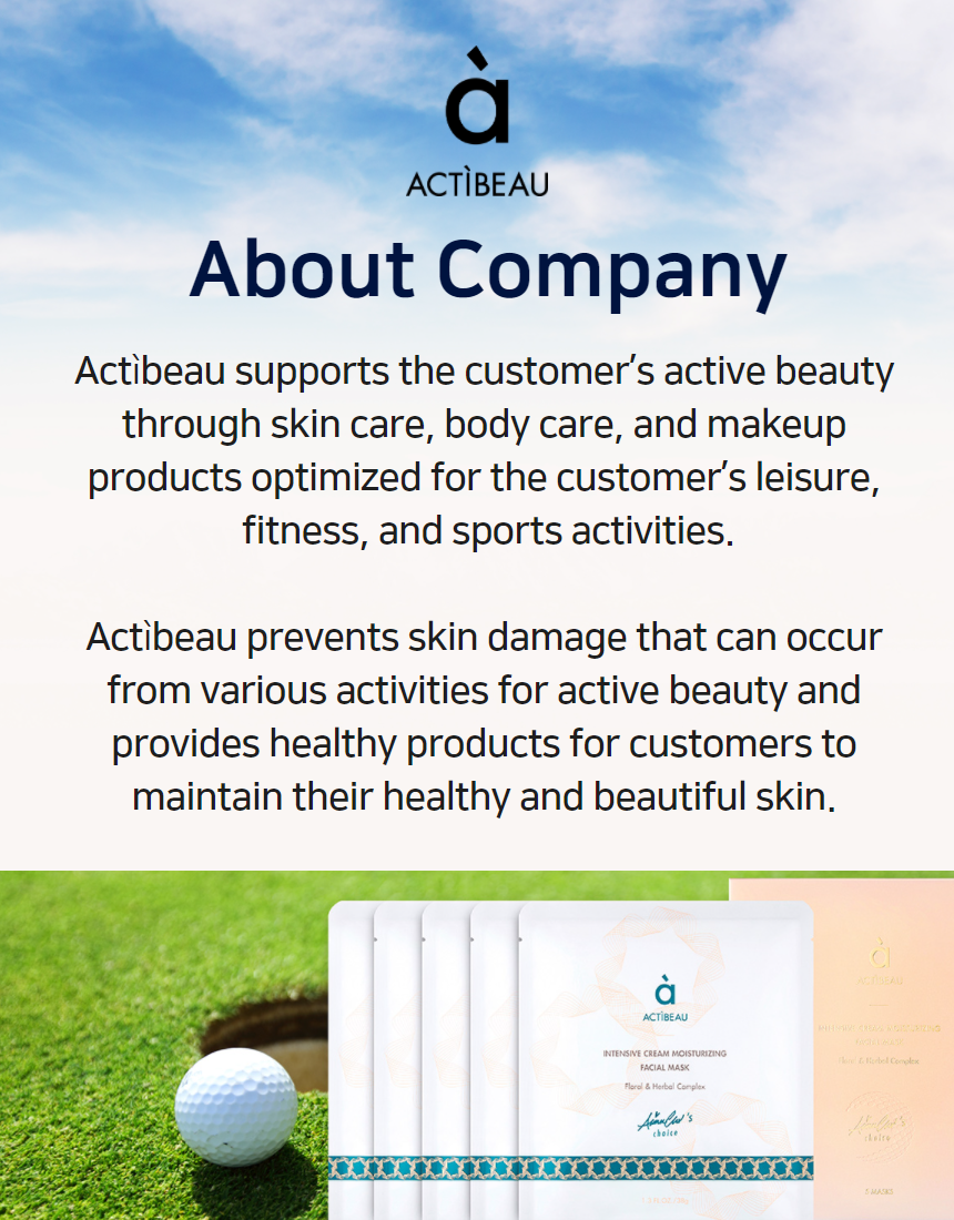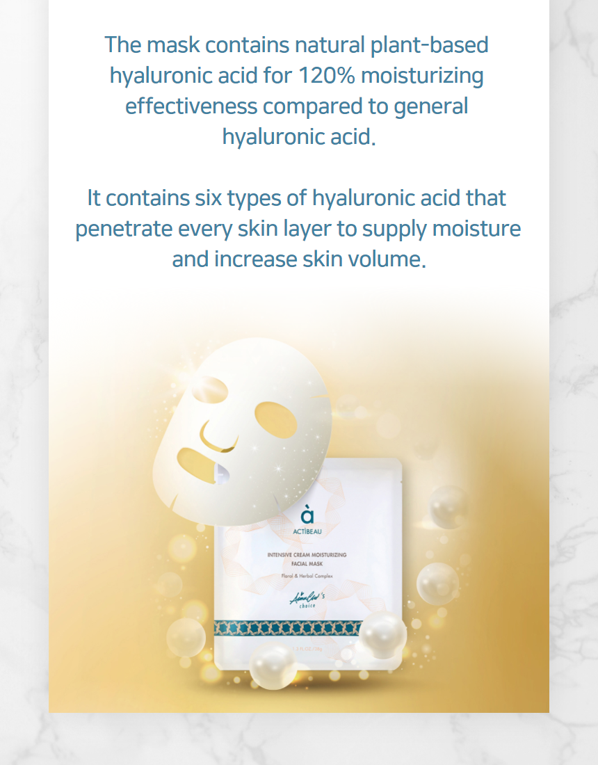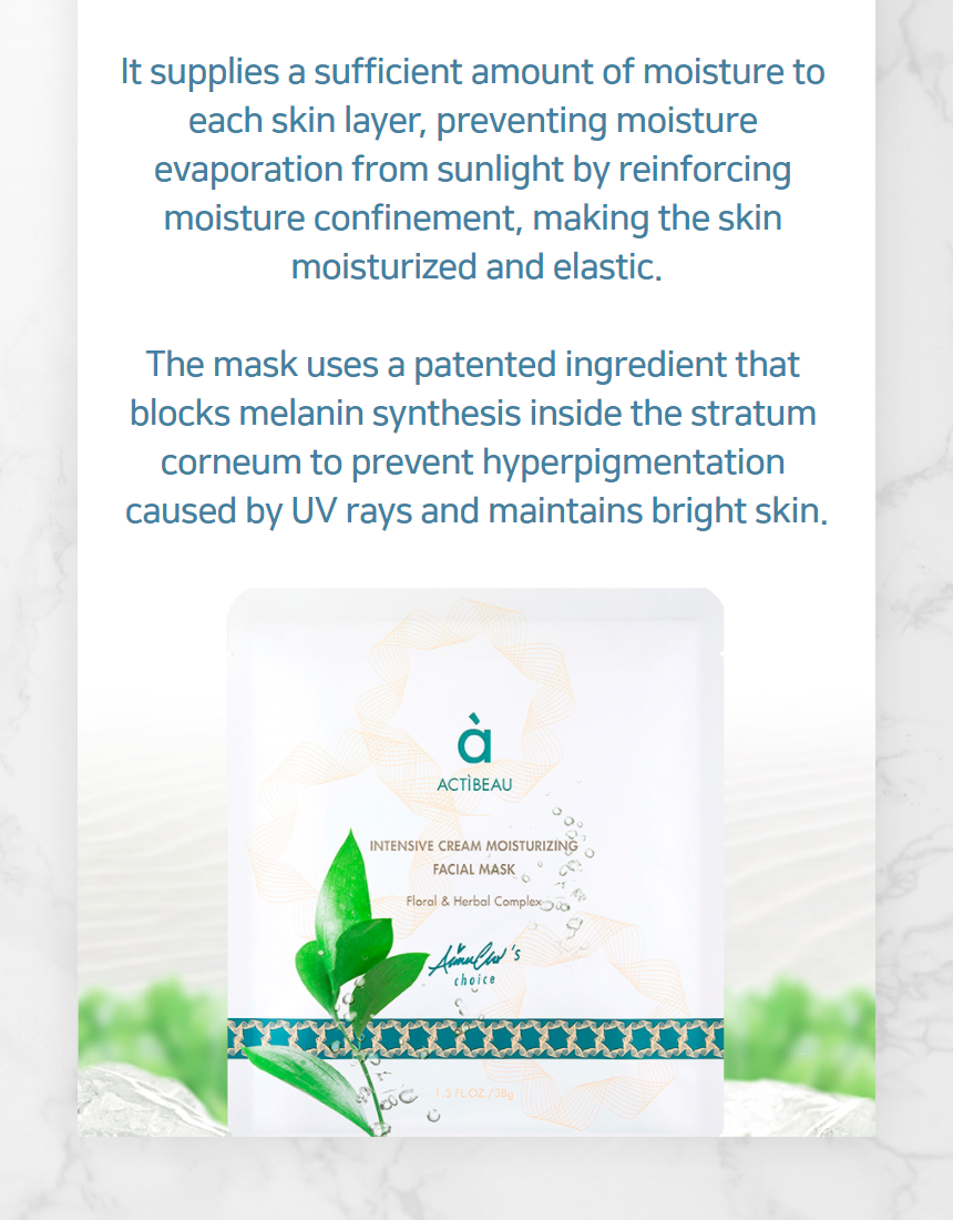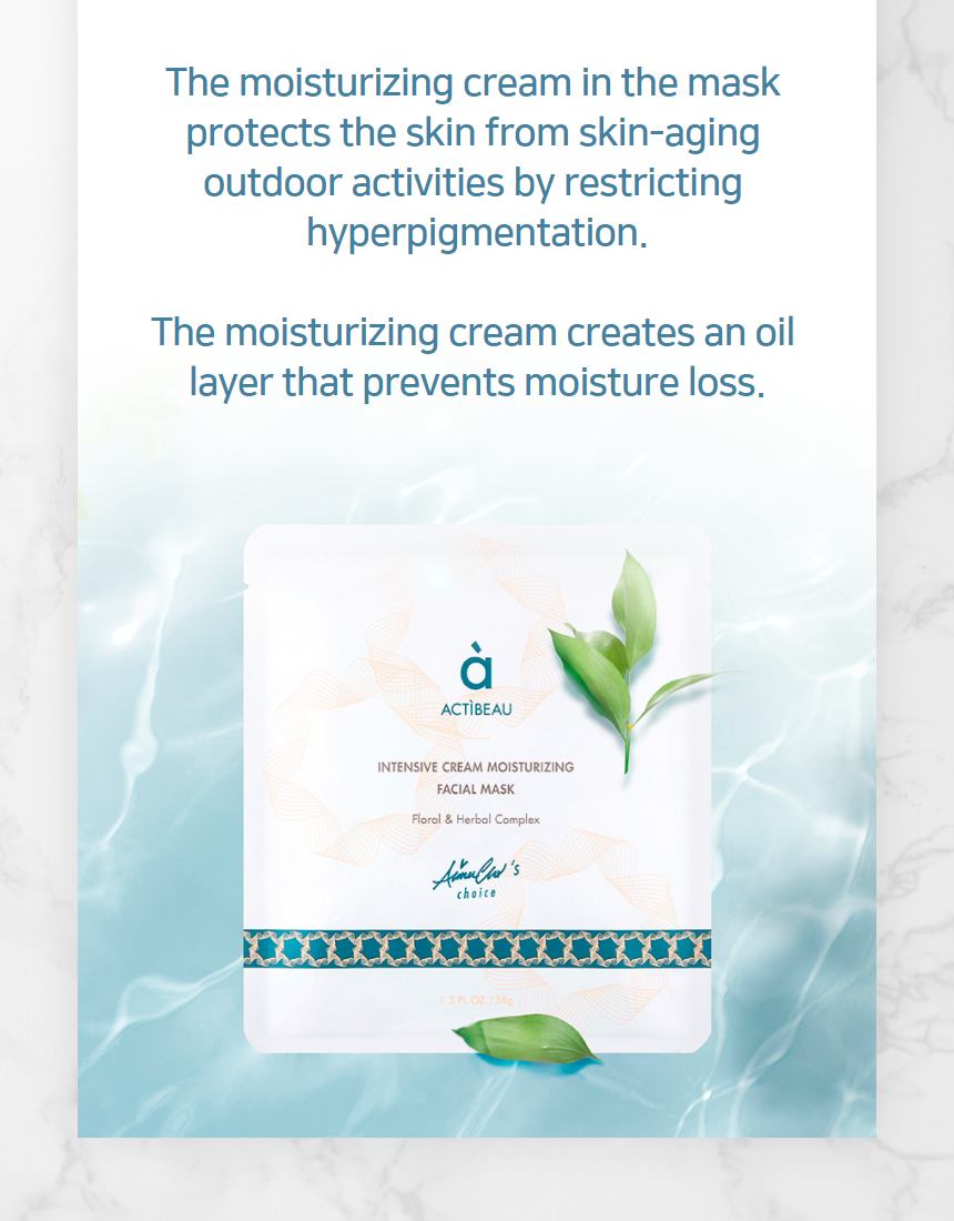 “ACTIBEAU INTENSIVE CREAM MOISTURIZING FACIAL MASK Moisture cream in the mask protects the skin from skin-aging outdoor activities by restricting hyperpigmentation.”