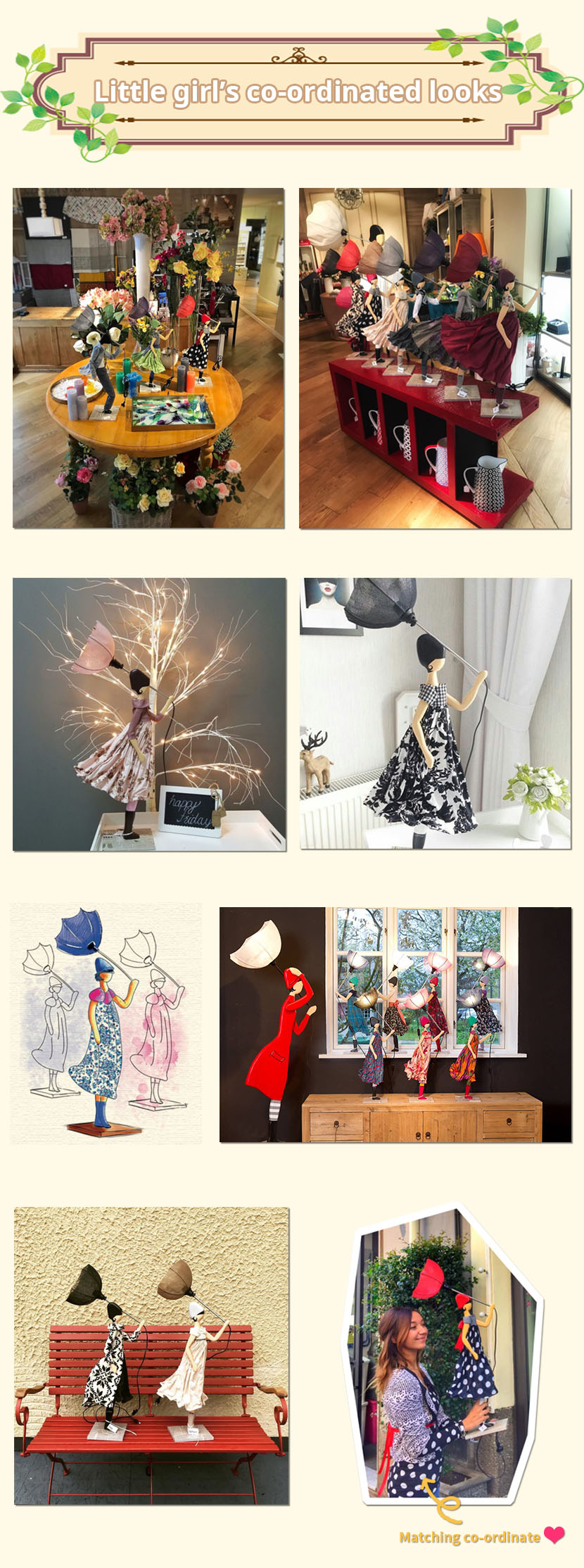 This collection reproduces the appearance of a young girl with turned over colorful umbrella and flapping fashionable dress because of strong wind into this lovely stand-light.