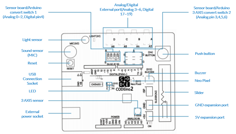 After cutting off the link the specific analog (digital) pin and sensor connection by a switch, and then change by the Arduino port; this mode enables to connect the jumper wire or Dupont wire cable to external products or module. At that moment if all the switches are set up at Arduino mode, you can use the CODEino2 and the Arduino Uno under the same conditions, most of the Arduino Uno compatible shield and module can be used so it extends the functions of CODEino2.