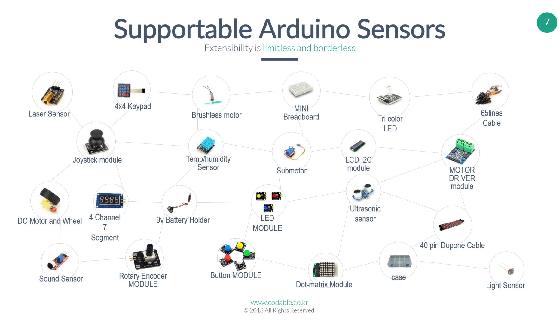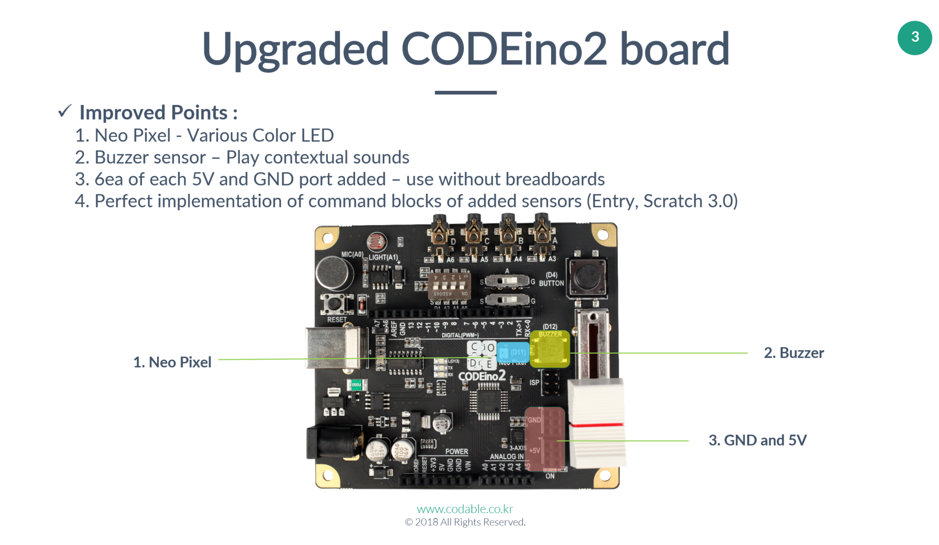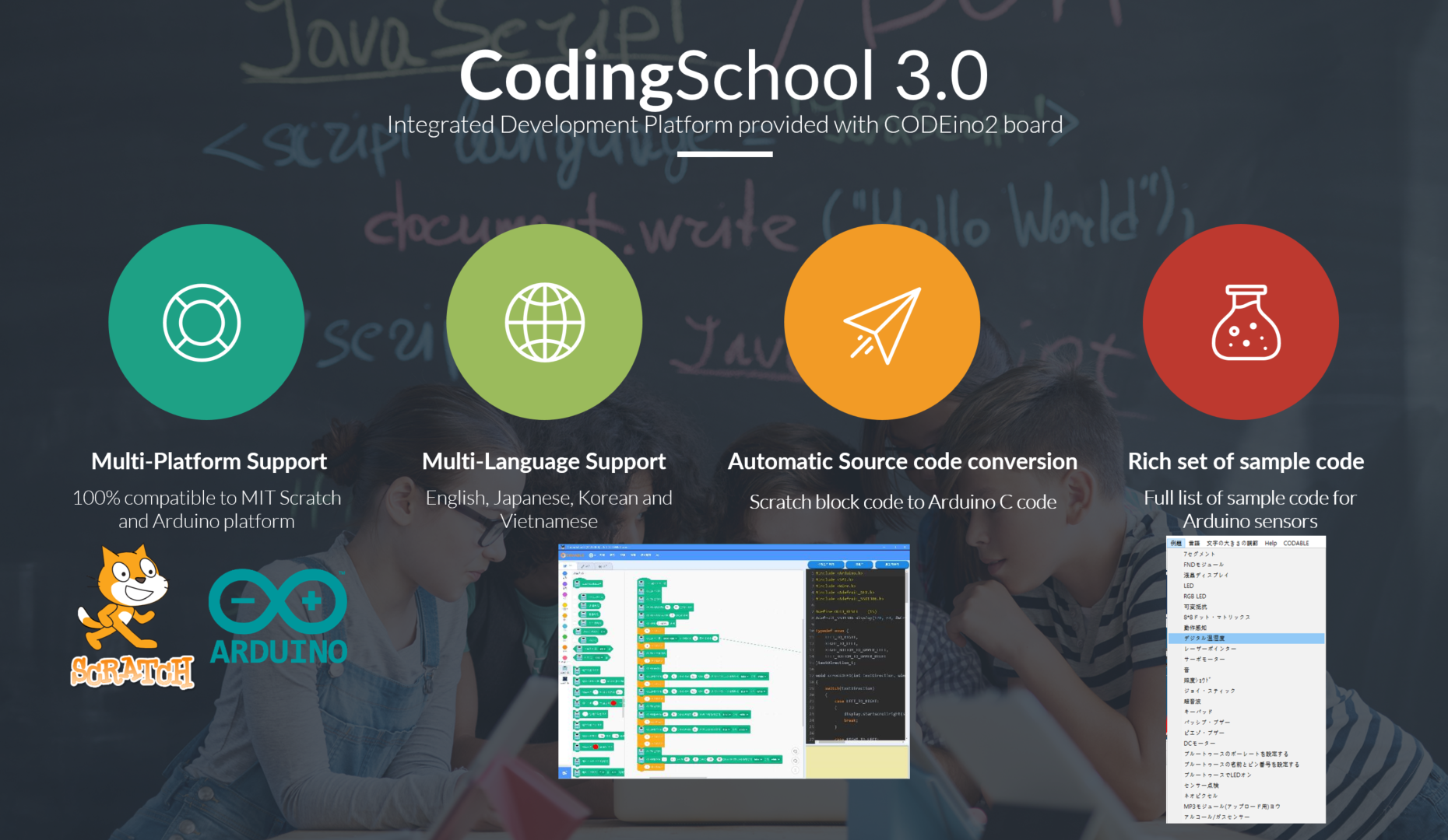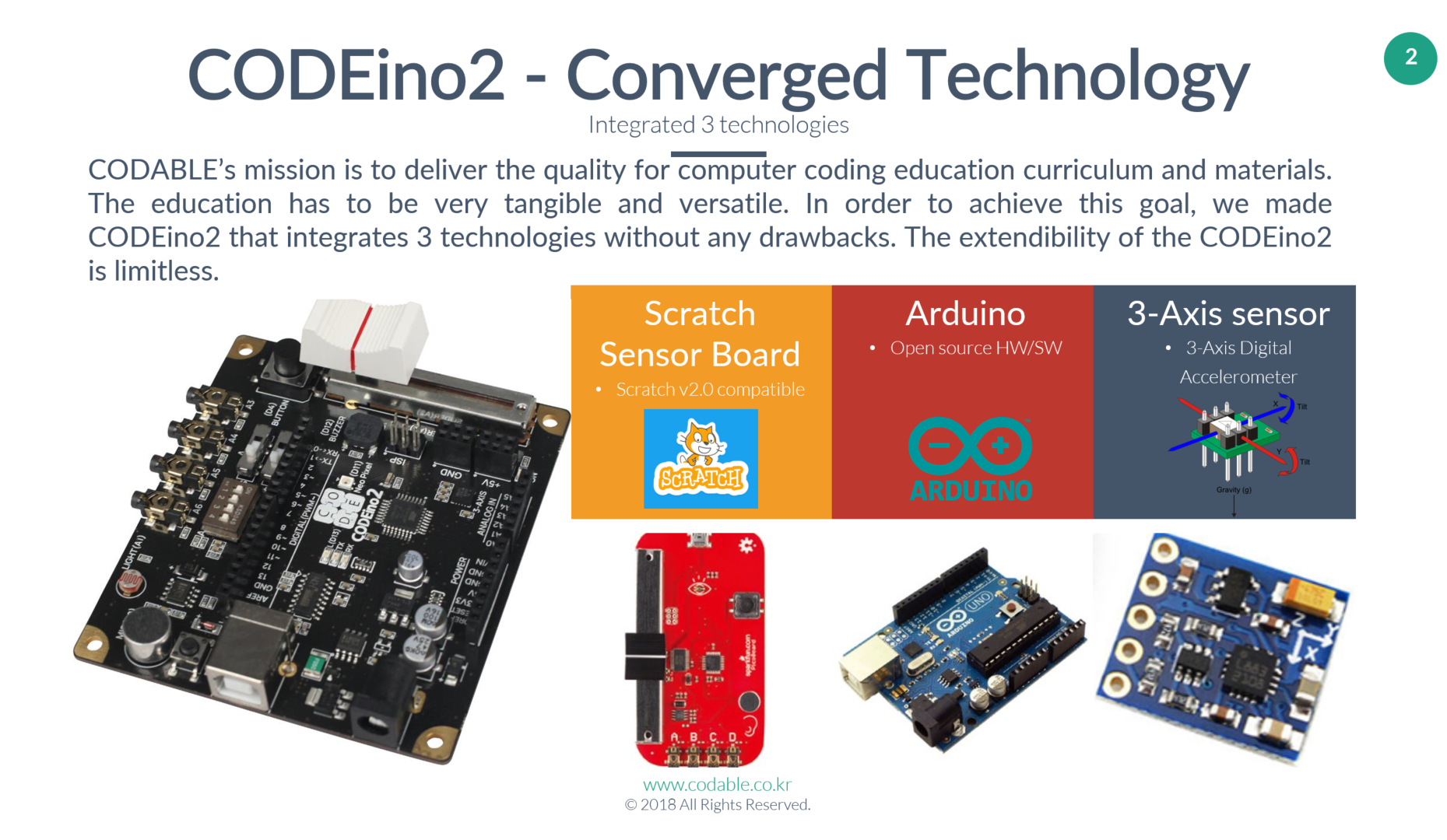 CODEIno2 board is a new type of single board microcontroller that combines Arduino and scratch sensor board, and is a Korean Arduino board for coding education officially adopted in 4 types of middle school ICT class textbooks.