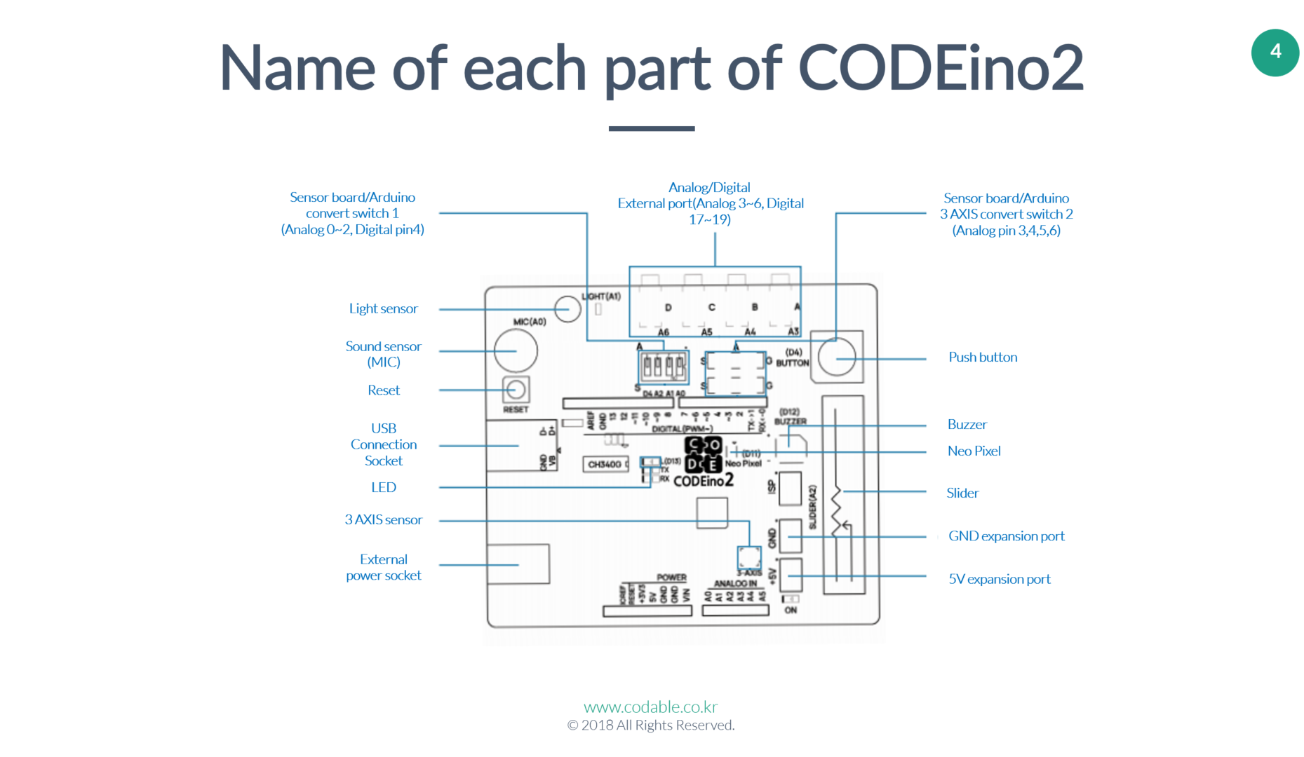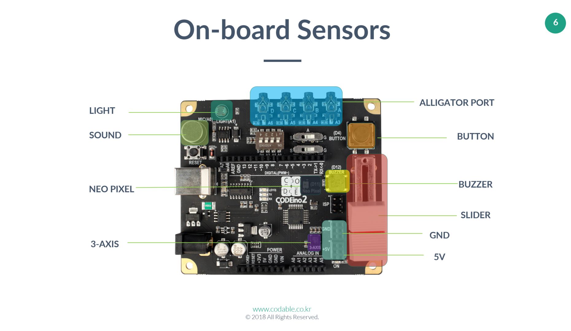 CODEIno2 is an Arduino compatible board, equipped with all functions of Arduino, as well as Light, Sound, Button, Slider and 3-axis acceleration sensors on the scratch sensor board as standard, and having 4 analog input ports, you can easily input the value of an external sensor through a simple alligator clip cable connection.