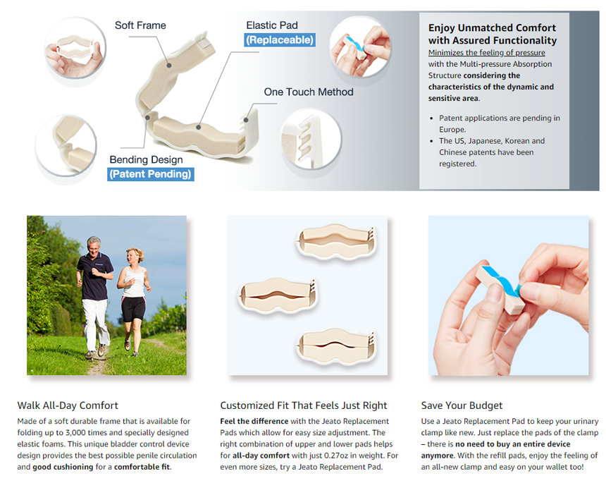 - DELUXE SOFTNESS & COMFORT – Jeato Incontinence Clamp is specially designed with new patented structure, soft frame, and cushion-able pad to ensure all-day comfort. Try the Jeato Incontinence Clamp just once, and experience a big difference in comfort compared to other penile clamps for men who feature rigid or hinge structures that are heavy to wear.