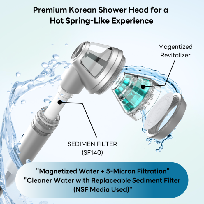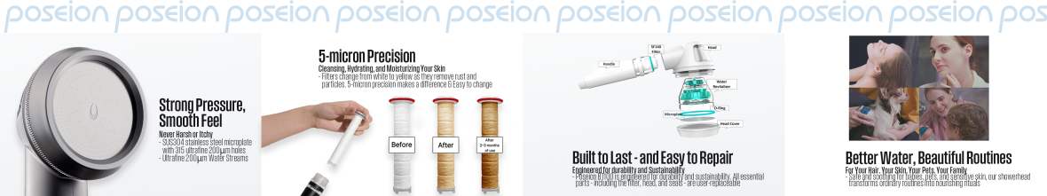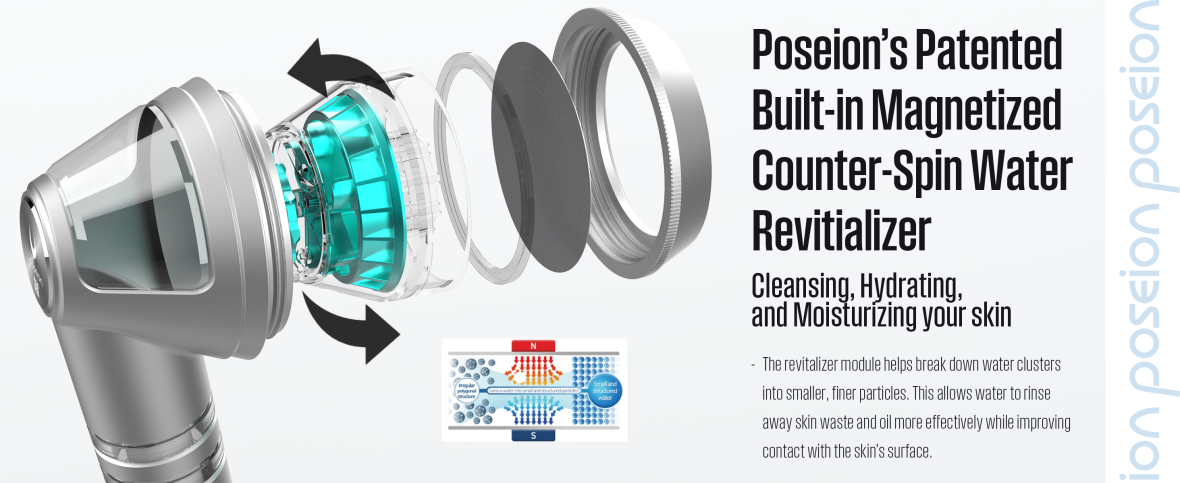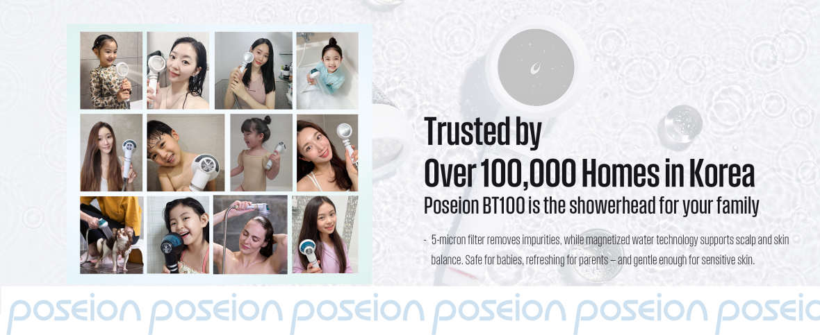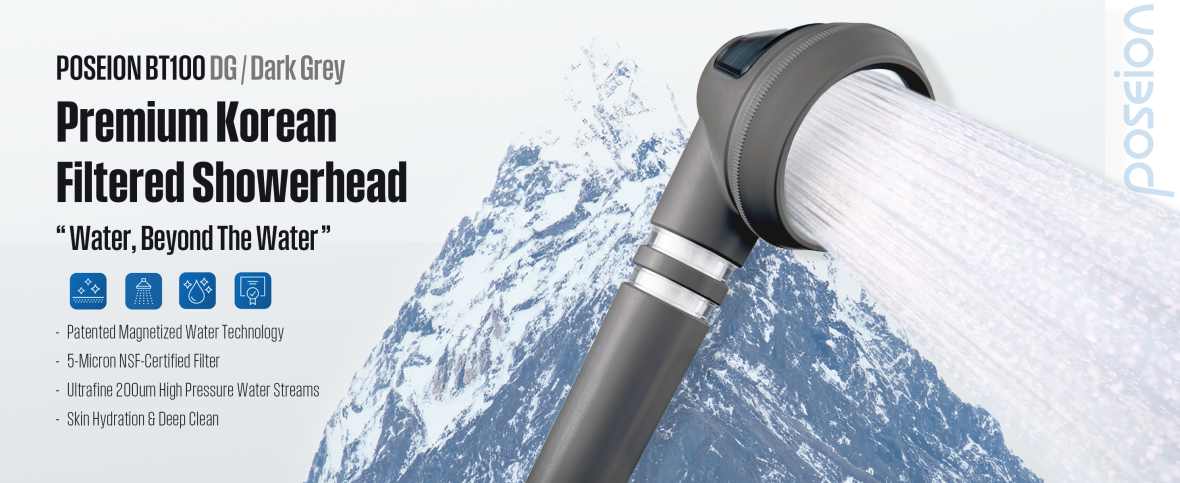 The 'Poseion BT100', a K-beauty care showerhead equipped with the internationally patented Reverse Spin Magnetize Turbine (Revitalizer). This unique technology transforms ordinary tap water into Revitalizing Water, making it ideal for skin care, scalp care, and overall beauty enhancement. Unlike typical showerheads, the 'Poseion BT100' is designed to offer skin and scalp benefits while you shower, making it a premium, multifunctional product.
