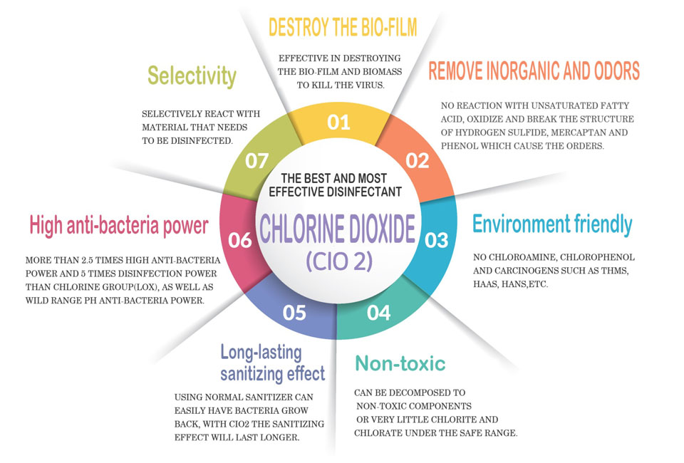 • Strong Antibacterial Effect: Solid chloride dioxide has two and a half times more oxidizing power