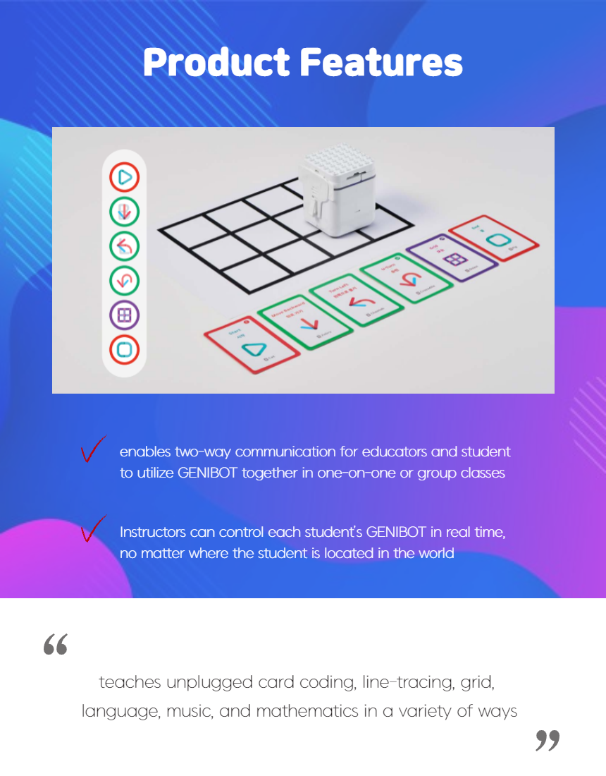 It is the world’s first educational platform service based on a robot, as the LIMS platform is a cloud-based interactive coding education solution. It enables two-way communication for educators and students to utilize GENIBOT together in one-on-one or group classes, both in person and remotely. Instructors can control each student’s GENIBOT in real time, no matter where the student is located in the world. Students can also learn by themselves, and teachers will be provided with full activity reports, helping make individualized instruction possible for every student.