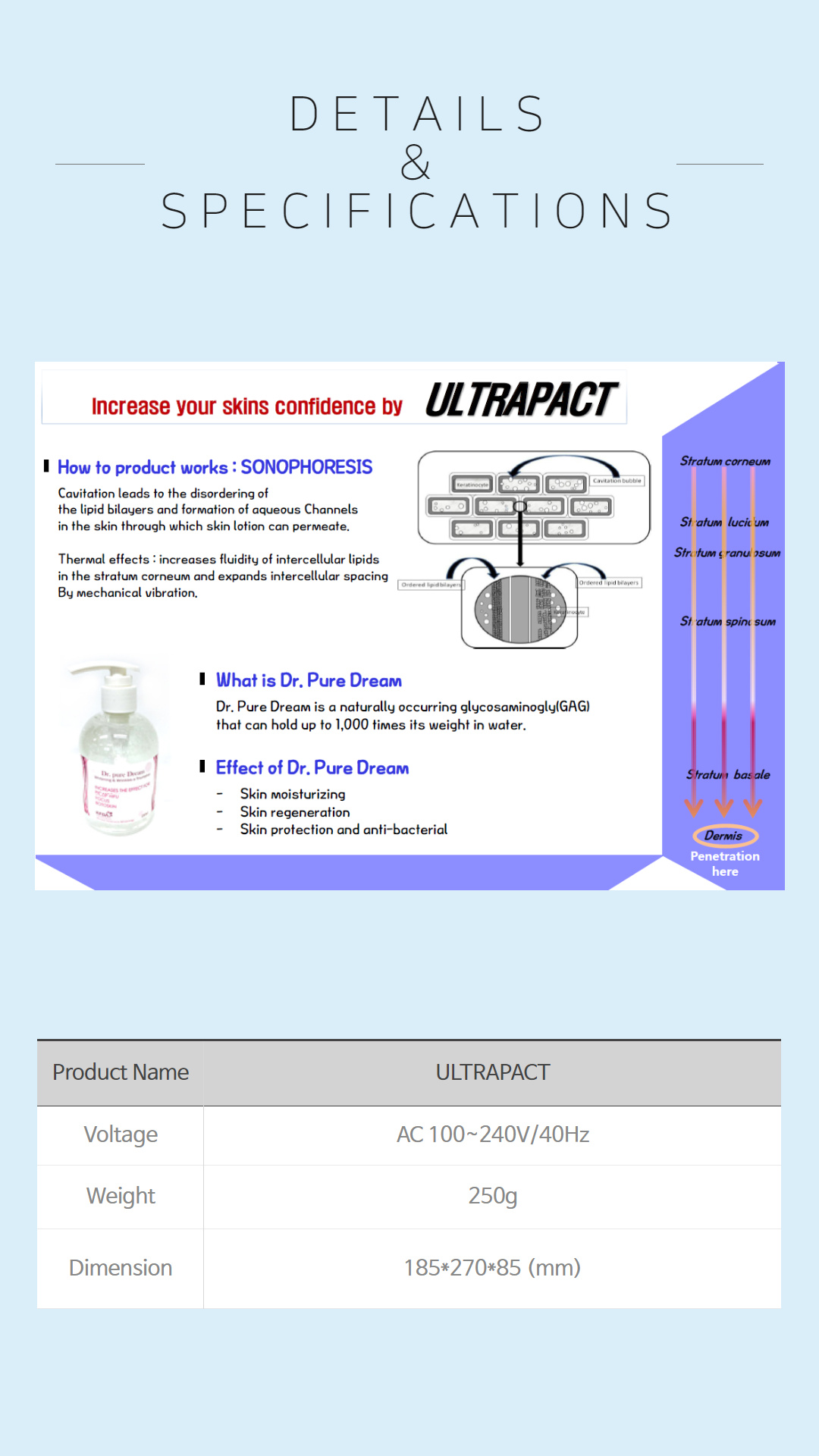 When applying cosmetics, topical drug delivery is 3~5%. ULTRAPACT's sonophoresis, a method