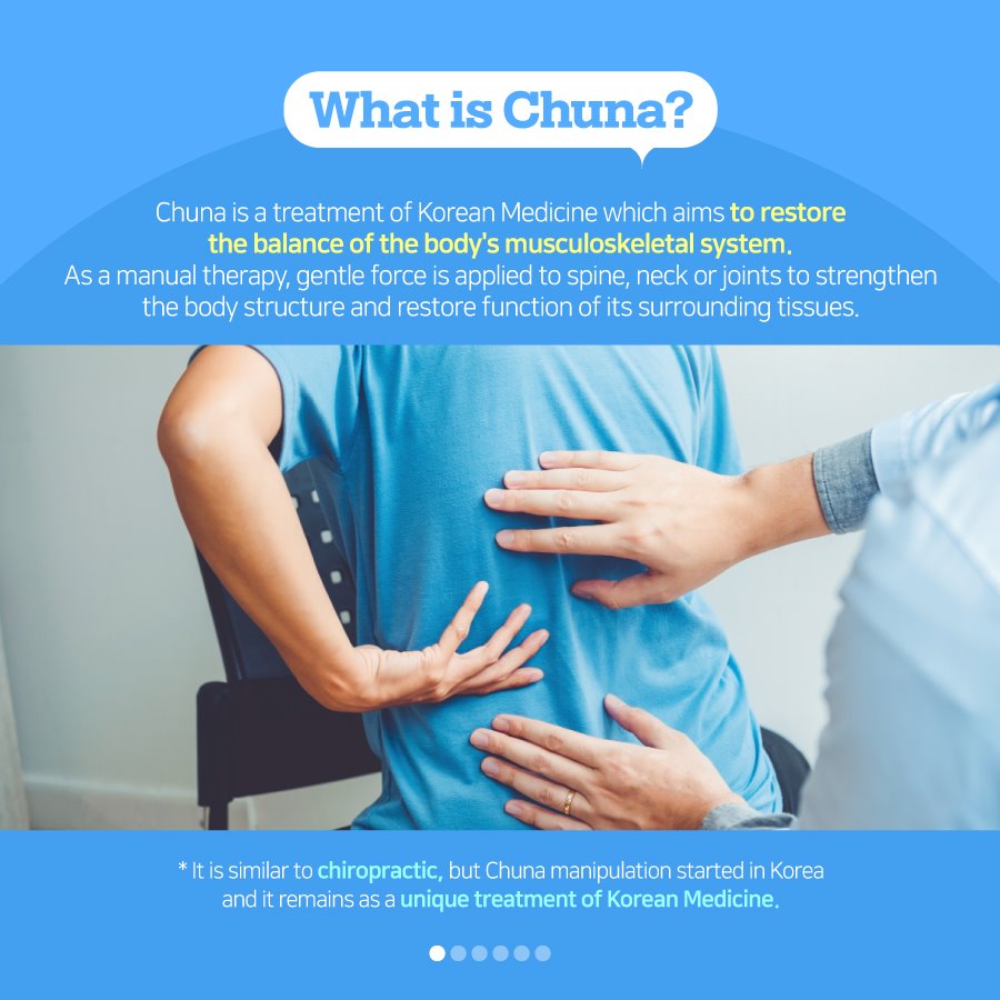 It is similar to chiropractic, but Chuna manipulation started in Korea and it remains a unique treatment of Korea Medicine.