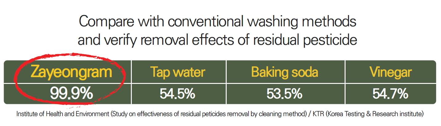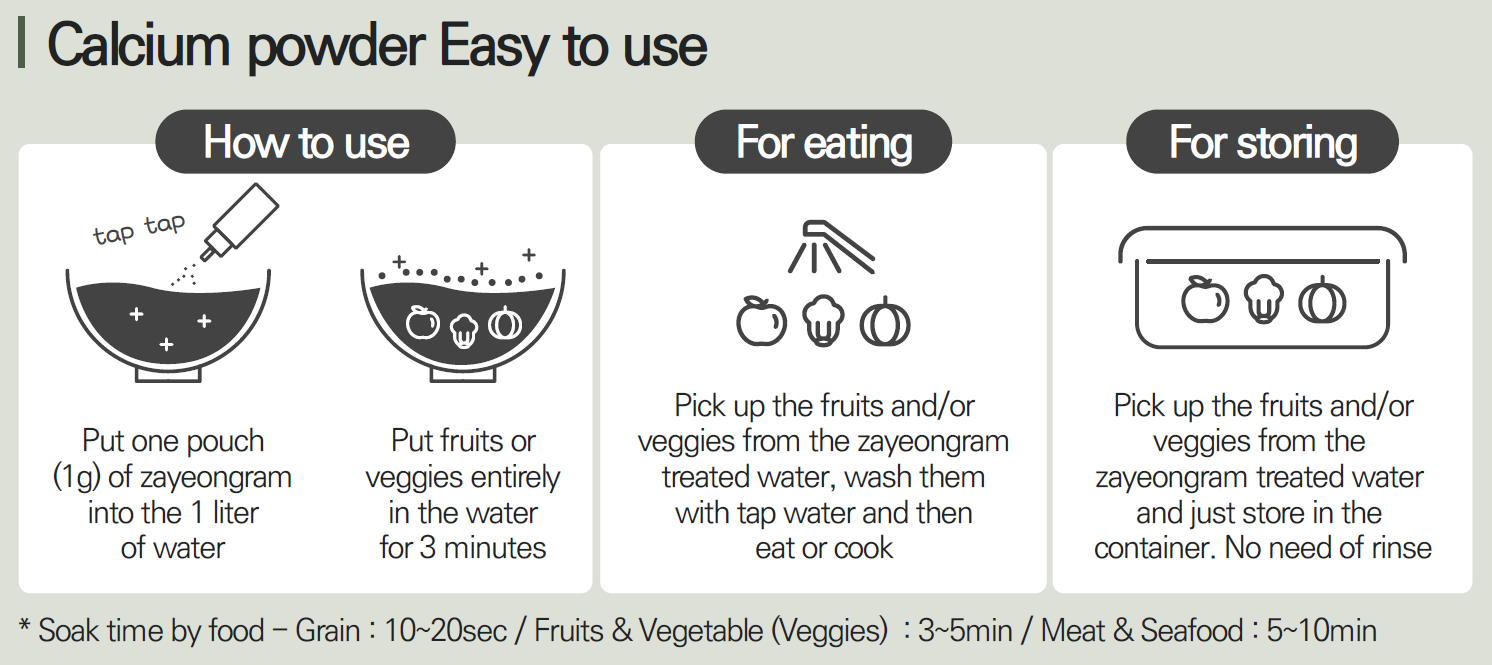Zayeongram Calcium Powder is easy to use with minimum usage of water, yet excellent removal of agricultural pesticides, chemicals, and residues