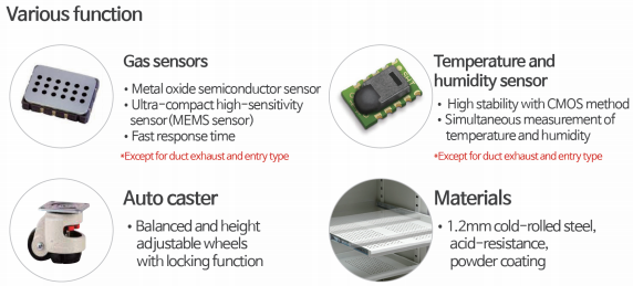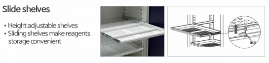 ● The Sliding shelves designdf for convenient and safe storage of chemicals. They are made from polypropylene (PP), which is resistant to acids, gases, and alkali’s. The anti-static system ensures safety against accidents caused by static electricity.