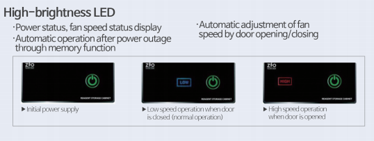 ● LED displays the power supply status, along with fan operation speeds (HIGH/LOW) depending on door status.
