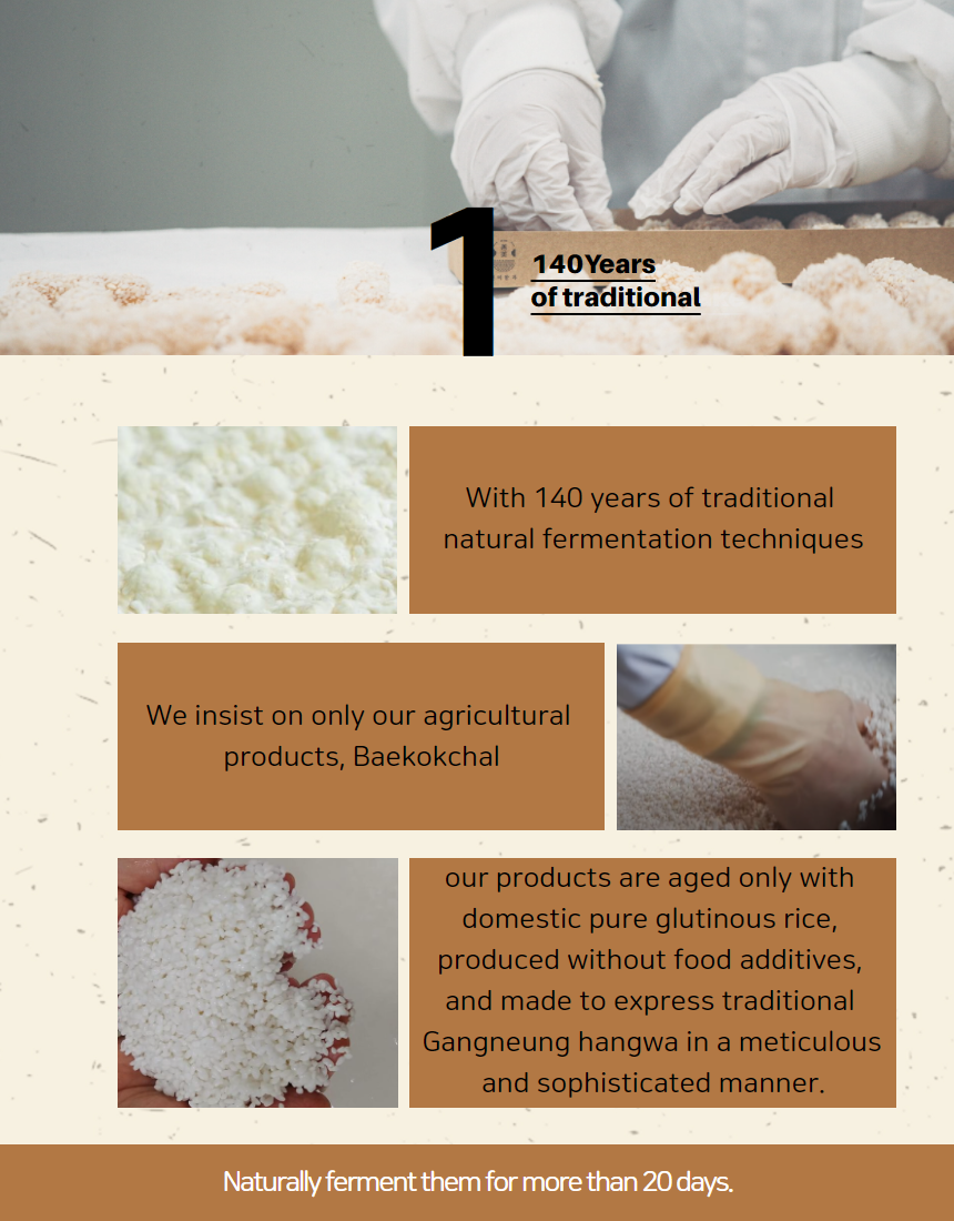 We started making traditional Korean sweets in the Sacheon Hangwa Village in Gangneung, as it was with the traditional natural fermentation technique and the old way.