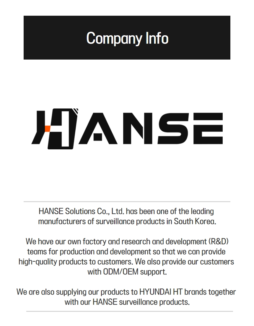 HANSE Solutions Co., Ltd. has been one of the leading manufacturers of surveillance products in South Korea. We have our own factory and research and development (R&D) teams for production and development so that we can provide high-quality products to customers. We also provide our customers with ODM/OEM support.