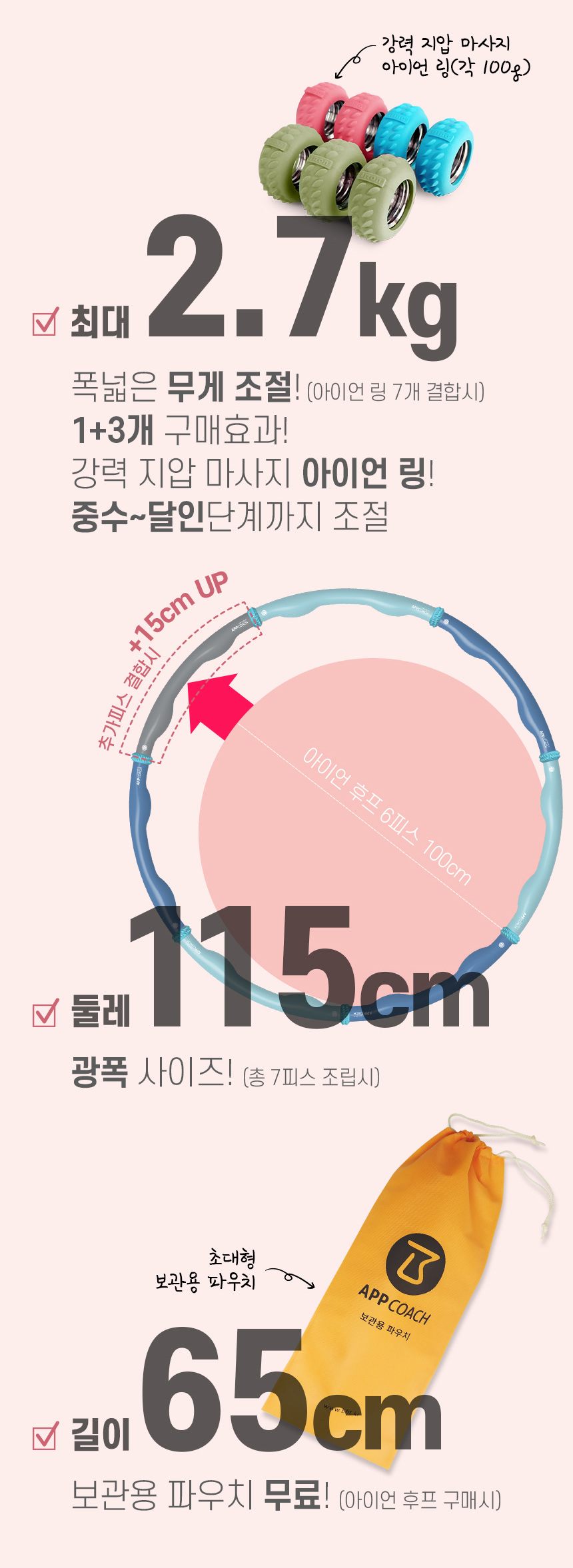 The protrusions on the massage ring stimulate the abdomen and sides to give a powerful acupressure massage. You can adjust the weight and the strength of the massage by installing seven massage rings as you like.