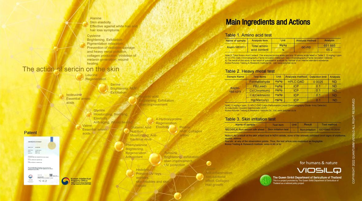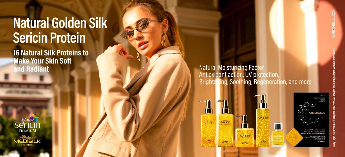 The main ingredients of sericin, produced in a 100% natural way, Sericin, Carotenoid, and Collagen are made in natural golden silk by golden silkworms.