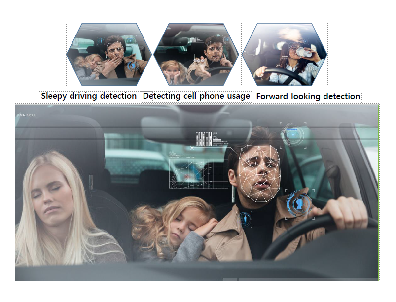 Image data (driver's heart rate, facial orientation, facial expression, movement, eyelid condition, etc.) are collected to detect and alert careless behavior such as drowsy driving, smartphone use, and beverage consumption to ensure driver safety.