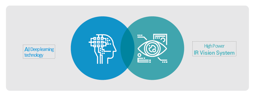 The optimal combination of AI deep learning technology and high-power IR Vision System protects the driver's safety by implementing high recognition rates even in wearing face masks and sunglasses, dark night/tunnel environments, and refractory environments.