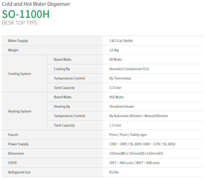 Hot and Cold Water Dispenser Desk Top Type SO1100H Made in Korea