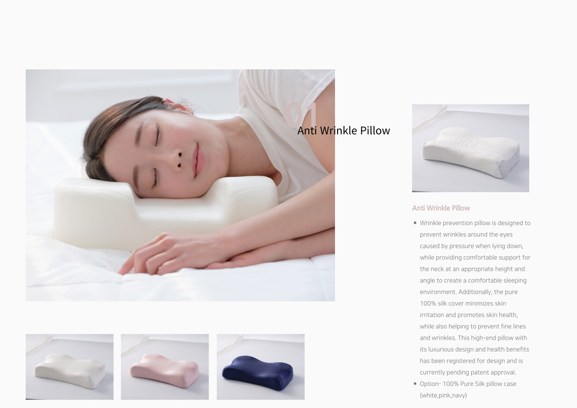 A premium memory foam pillow designed to reduce facial wrinkles during sleep. With an ergonomic shape and soft, supportive structure, it offers both comfort and beauty benefits. Available in elegant White, Pink, and Navy colors.
