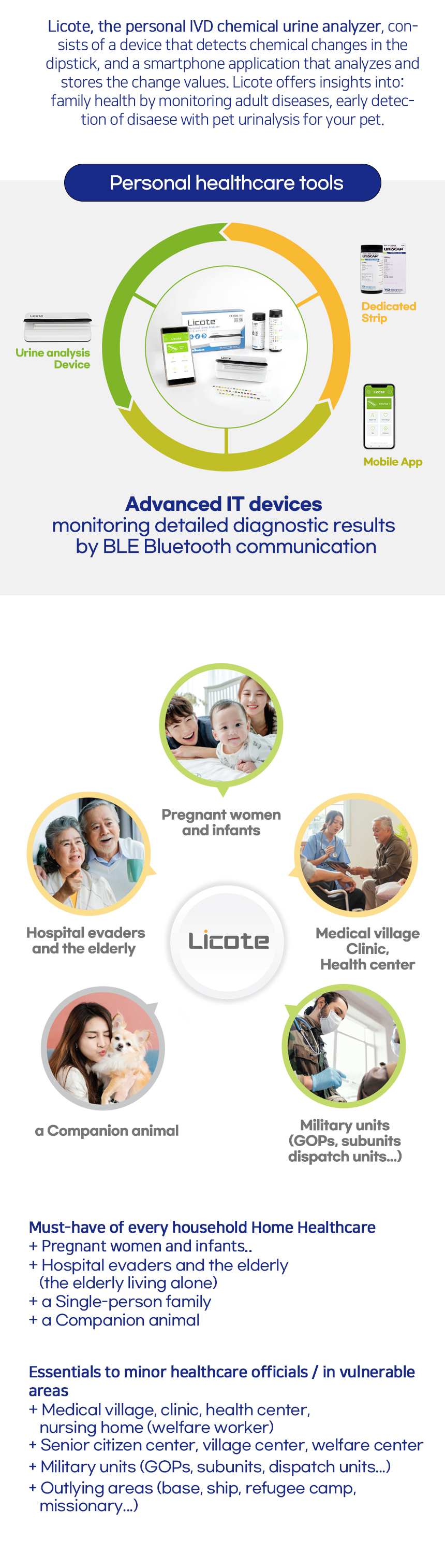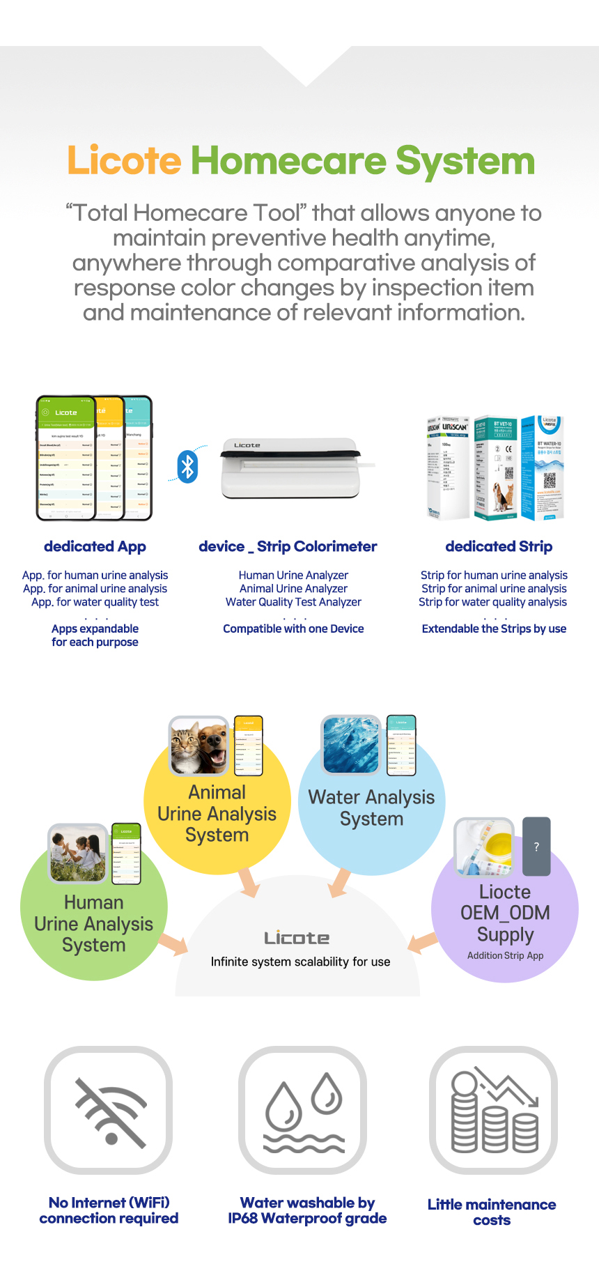 • Usage: It consists of a device that detects chemical changes in a test strip with a reagent pad attached and a smartphone application that analyzes and stores the chemical change values.