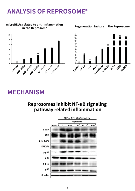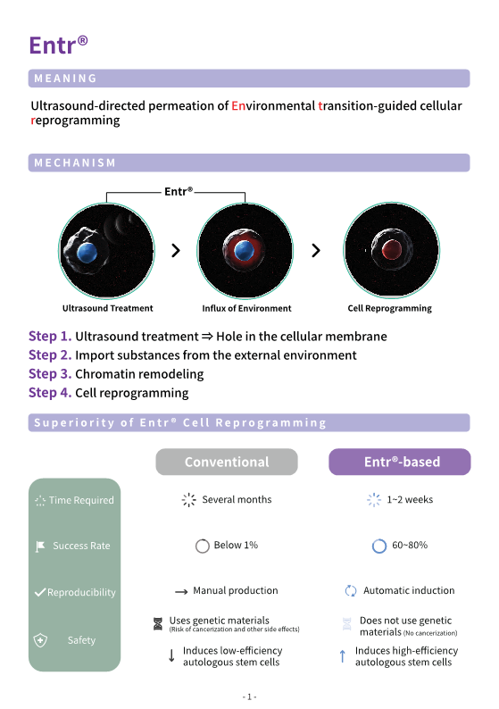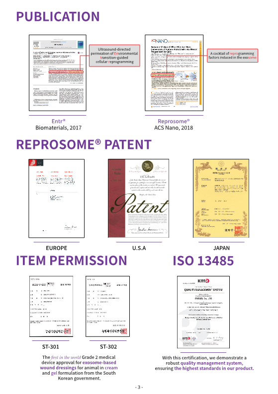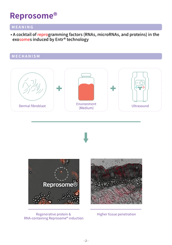 Reprosome by STEMON utilizes the Entr technology to harness exosomes derived from induced pluripotent stem cells (iPS) generated from skin fibroblasts. These Reprosomes are rich in cellular reprogramming factors, regeneration-related proteins, RNA, microRNA, and more. Being induced pluripotent stem cells, they possess Oct4, Sox2, Nanog, similar to embryonic stem cells.