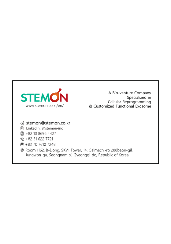 Exosomes typically range from 30 to 200nm in size. STEMON's automated manufacturing and Ultrafiltration method allow for the isolation of exosomes within the specified size range (50-200nm), ensuring homogeneity. This not only establishes functional differentiators with various cellular reprogramming factors but also emphasizes the distinctive manufacturing consistency and exosome-specific processes employed by STEMON.