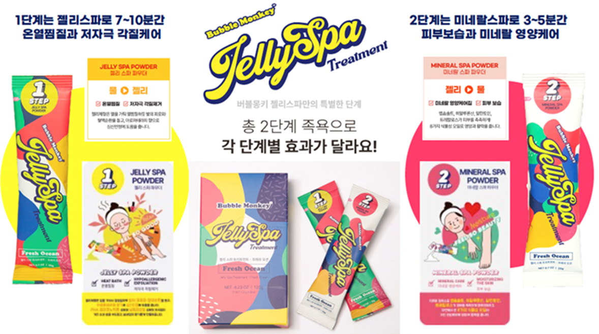 Jelly Spa powder changes the water into a jelly-like substance within 40 seconds. Not only does it change its form, it also maintains heat and removes dead skin. You can enjoy the calming scent and the soft texture of “hot jelly” for 7 to 10 minutes.