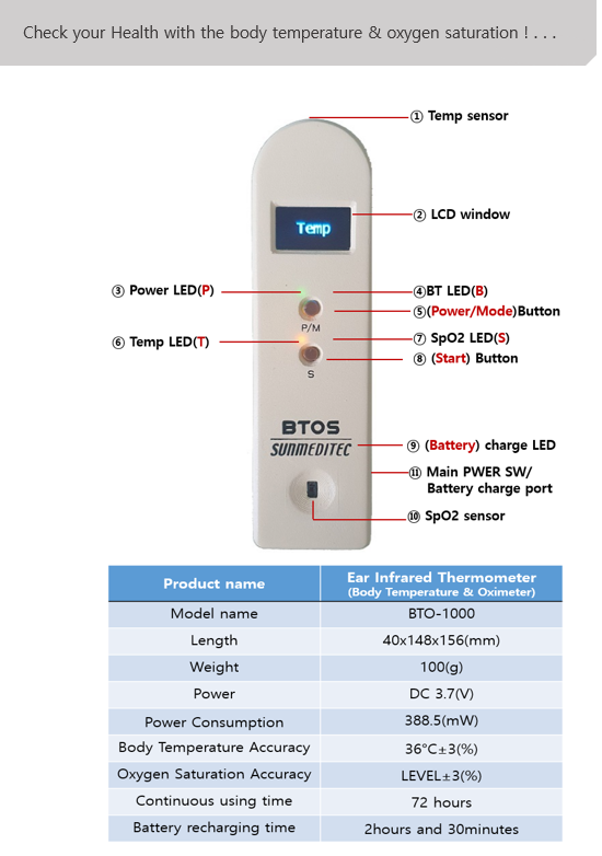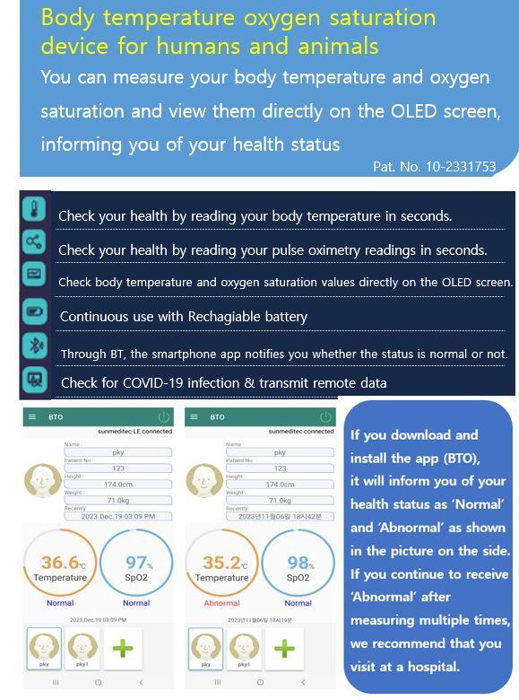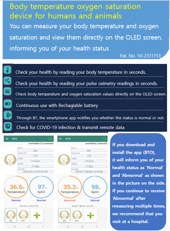 - Body temperature oxygen saturation device for human and animal.