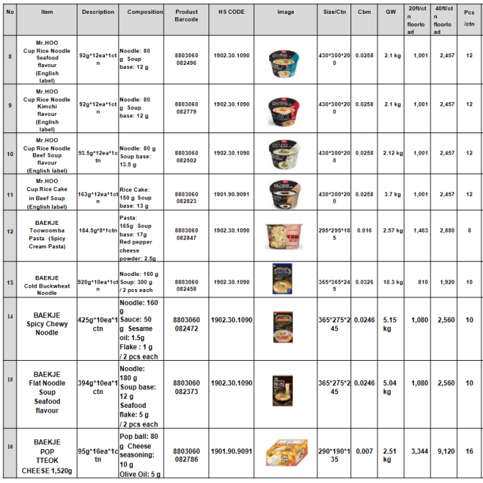 • Flavor/Taste: seafood, Kimchi, instant rice cake soup & green onion soup