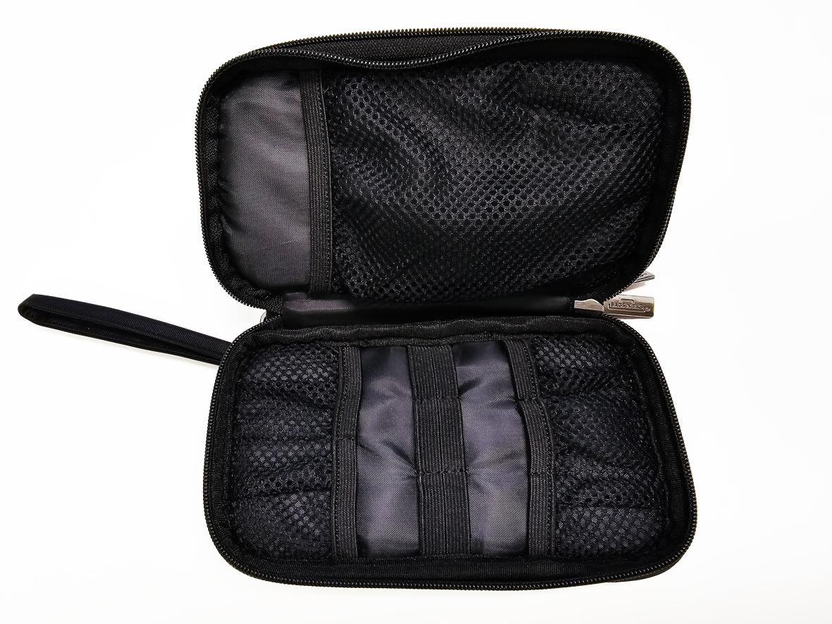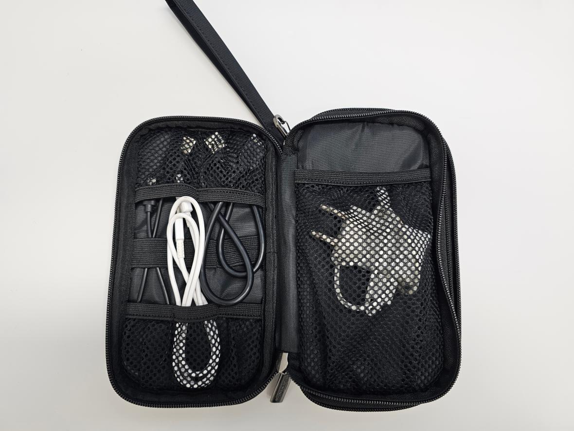 There are two zippers for a total of four sides. It has storage space. The storage space has a band to secure the cable and a pocket to store small items.