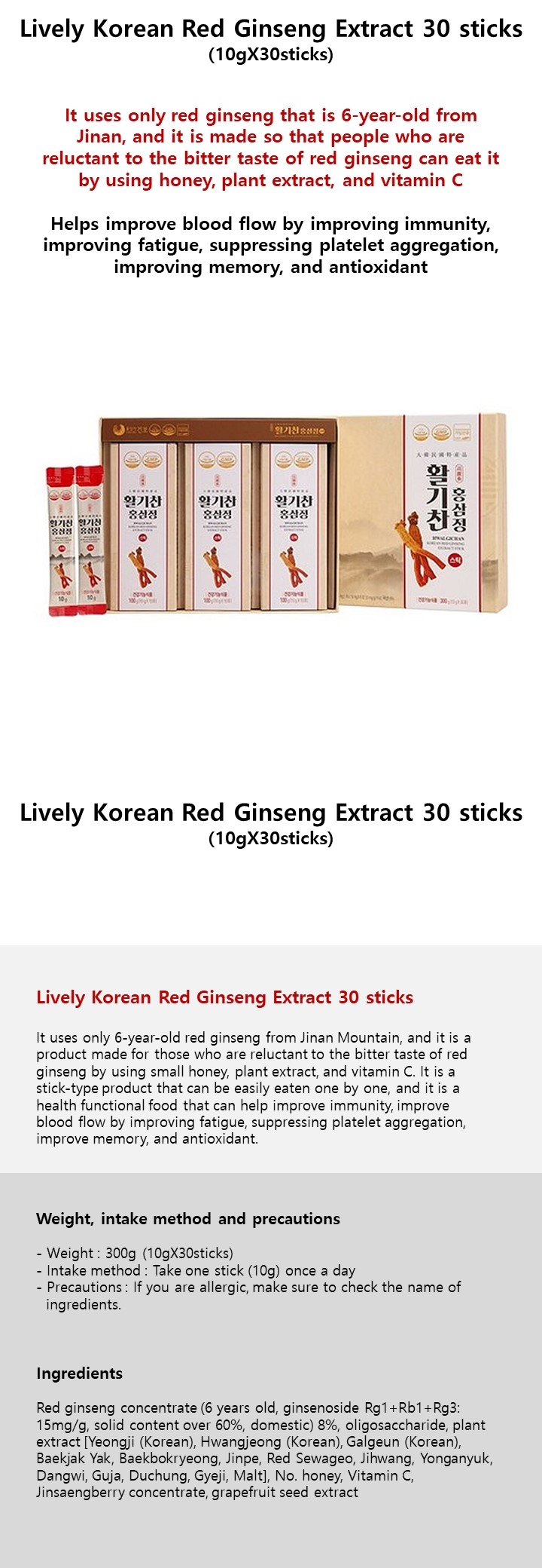 • Main Ingredient: Red ginseng concentrate (solid content over 60%, total of ginsenosides Rg1, Rb1 and Rg3 15mg/g, domestically produced)