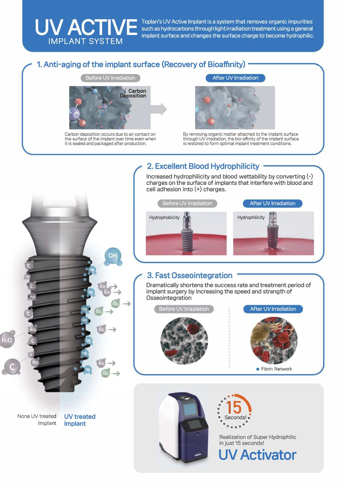The dental implant surface treatment system induces a photocatalytic effect on the implant surface with just 15 seconds of UV irradiation.