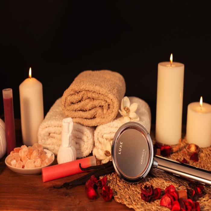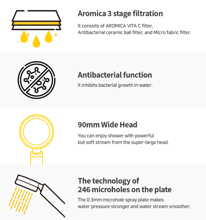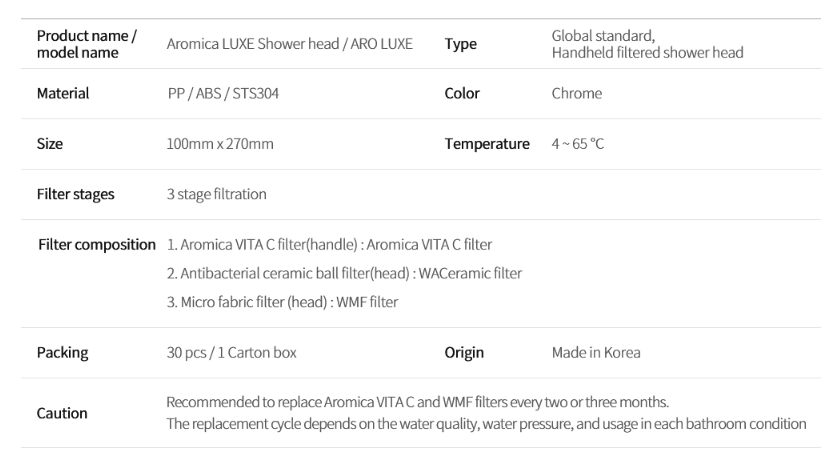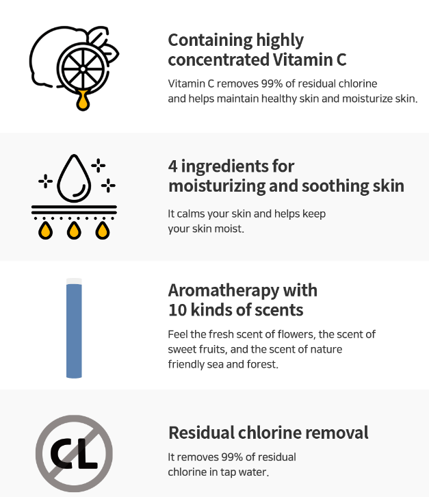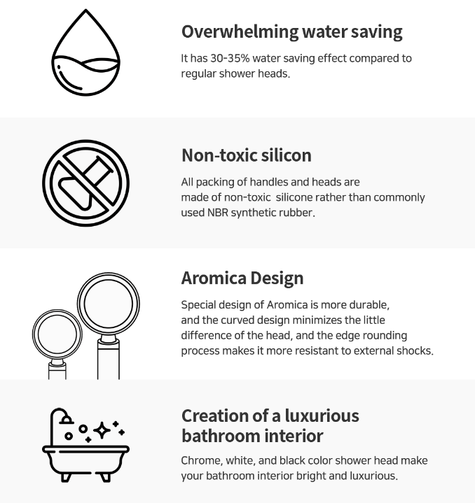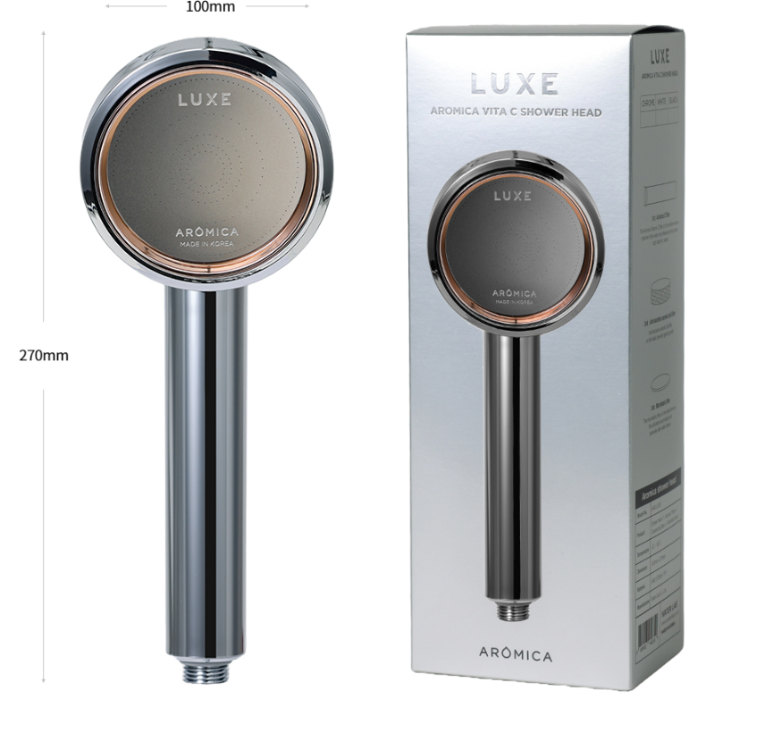 Aromica shower head contains rich aroma oil and vitamin C to help restore your skin.